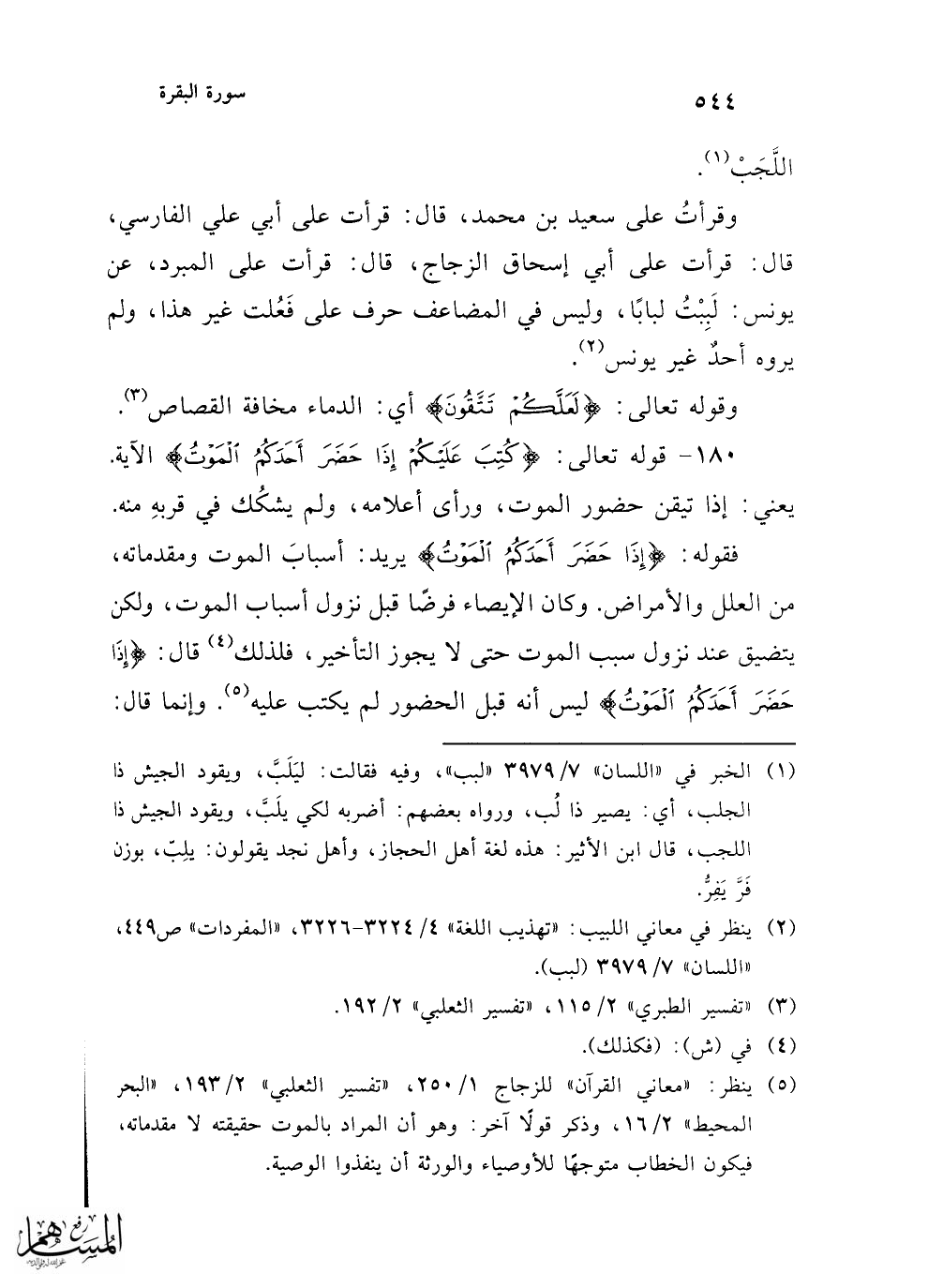 (¬5) ينظر: "معاني القرآن" للزجاج 1/ 250، "تفسير الثعلبي" 2/ 193، "البحر المحيط" 2/ 16، وذكر قولًا آخر: وهو أن المراد بالموت حقيقته لا مقدماته، فيكون الخطاب متوجهًا للأوصياء والورثة أن ينفذوا الوصية.