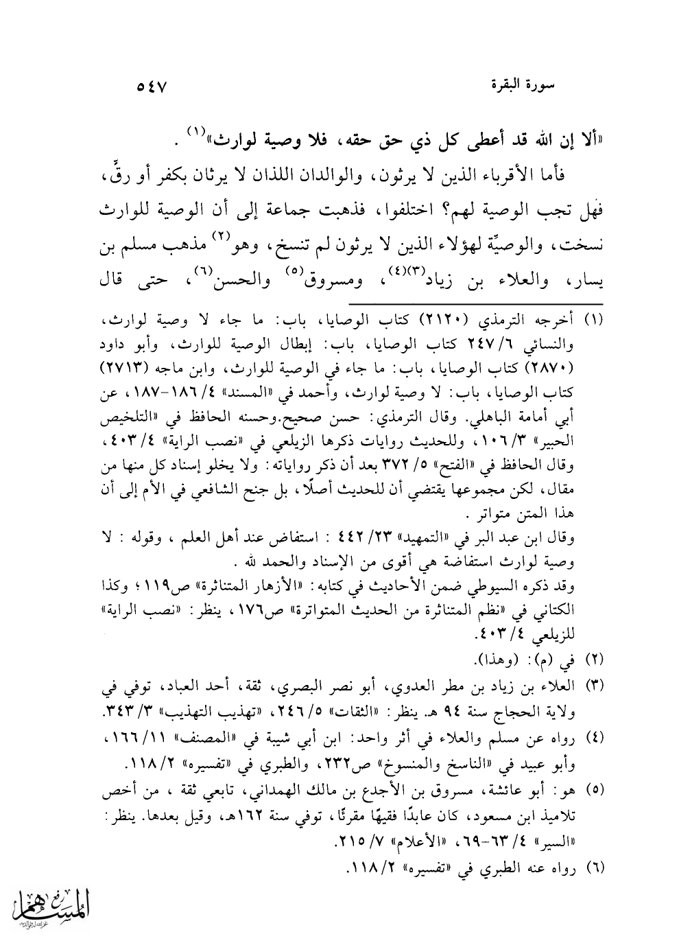 (¬4) رواه عن مسلم والعلاء في أثر واحد: ابن أبي شيبة في "المصنف" 11/ 166، وأبو عبيد في "الناسخ والمنسوخ" ص 232، والطبري في "تفسيره" 2/ 118.