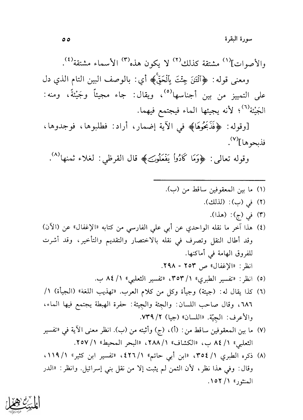 (¬4) هذا آخر ما نقله الواحدي عن أبي علي الفارسي من كتابه "الإغفال" عن (الآن) وقد أطال النقل وتصرف في نقله بالاختصار والتقديم والتأخير، وقد أشرت للفروق الهامة في أماكنها. انظر: "الإغفال" ص 253 - 298.