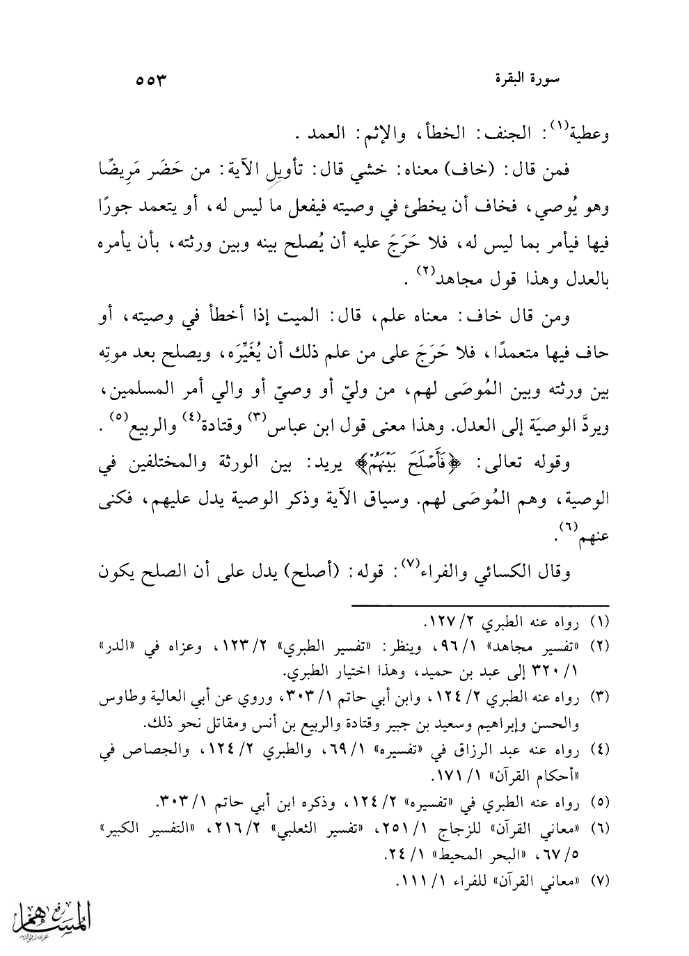 ومن قال خاف: معناه علم، قال: الميت إذا أخطأ في وصيته، أو حاف فيها متعمدًا، فلا حَرَجَ على من علم ذلك أن يُغَيِّرَه، ويصلح بعد موتِه بين ورثته وبين المُوصَى لهم، من وليّ أو وصيّ أو والي أمر المسلمين، ويردَّ الوصيَة إلى العدل. وهذا معنى قول ابن عباس (¬3) وقتادة (¬4) والربيع (¬5).