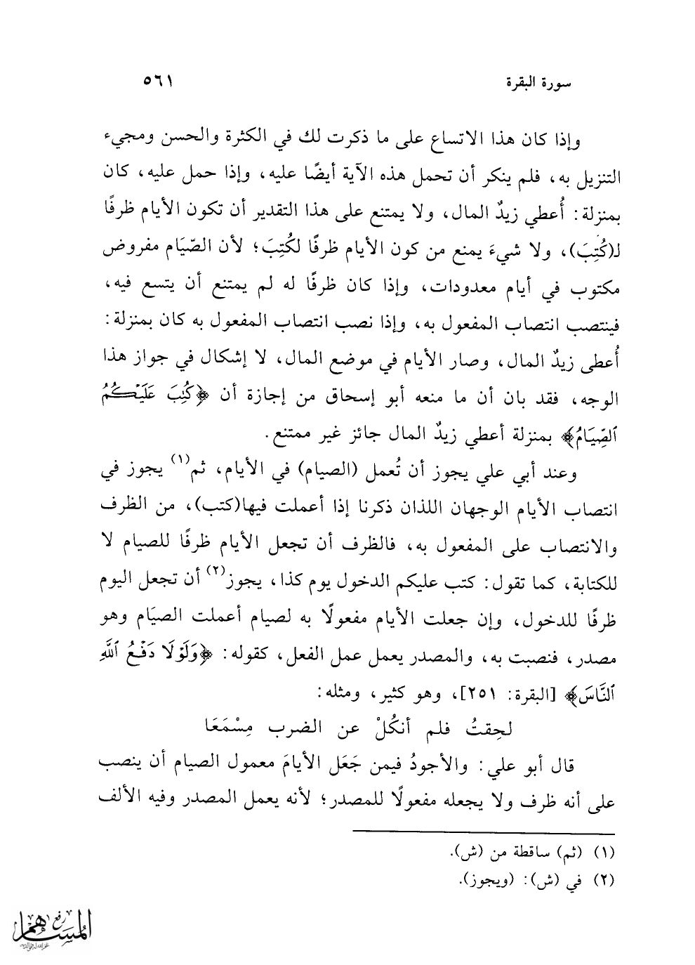 وعند أبي علي يجوز أن تُعمل (الصيام) في الأيام، ثم (¬1) يجوز في انتصاب الأيام الوجهان اللذان ذكرنا إذا أعملت فيها (كتب)، من الظرف والانتصاب على المفعول به، فالظرف أن تجعل الأيام ظرفًا للصيام لا للكتابة، كما تقول: كتب عليكم الدخول يوم كذا، يجوز (¬2) أن تجعل اليوم ظرفًا للدخول، وإن جعلت الأيام مفعولًا به لصيام أعملت الصيَام وهو مصدر، فنصبت به، والمصدر يعمل عمل الفعل، كقوله: {وَلَوْلَا دَفْعُ اللَّهِ النَّاسَ} [البقرة: 251]، وهو كثير، ومثله: