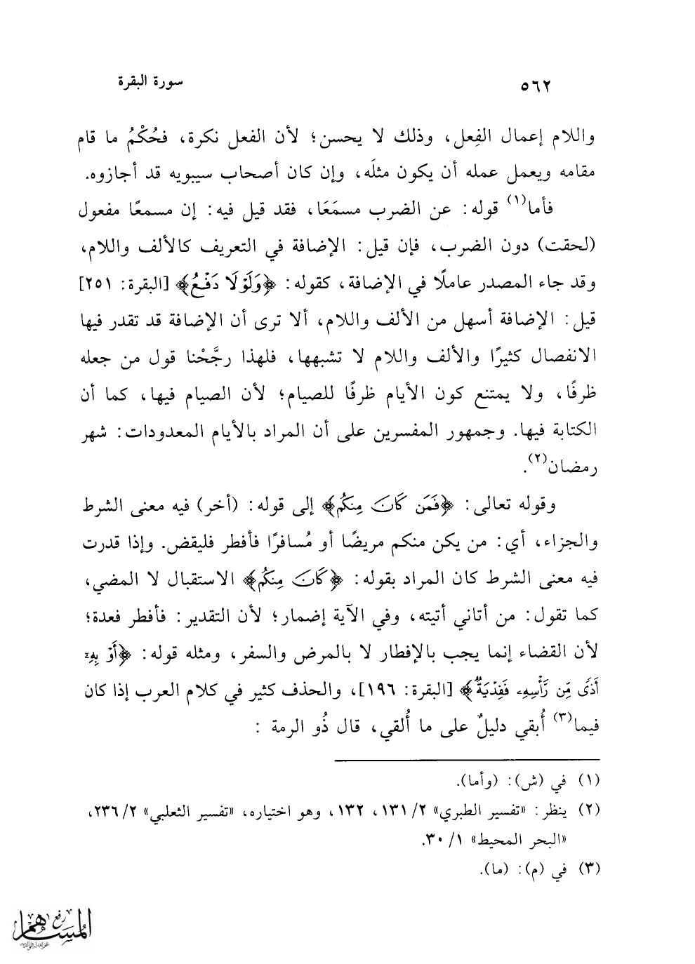 فأما (¬1) قوله: عن الضرب مسمَعَا، فقد قيل فيه: إن مسمعًا مفعول (لحقت) دون الضرب، فإن قيل: الإضافة في التعريف كالألف واللام، وقد جاء المصدر عاملًا في الإضافة، كقوله: {وَلَوْلَا دَفْعُ} [البقرة: 251] قيل: الإضافة أسهل من الألف واللام، ألا ترى أن الإضافة قد تقدر فيها الانفصال كثيرًا والألف واللام لا تشبهها، فلهذا رجَّحْنا قول من جعله ظرفًا، ولا يمتنع كون الأيام ظرفًا للصيام؛ لأن الصيام فيها، كما أن الكتابة فيها. وجمهور المفسرين على أن المراد بالأيام المعدودات: شهر رمضان (¬2).