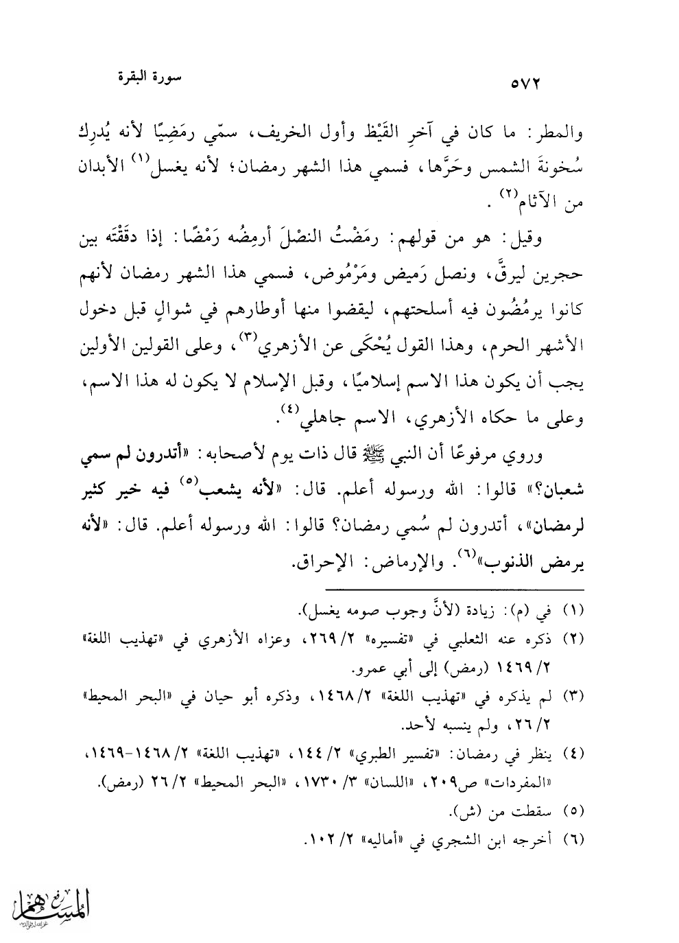 (¬4) ينظر في رمضان: "تفسير الطبري" 2/ 144، "تهذيب اللغة" 2/ 1468 - 1469، "المفردات" ص209، "اللسان" 3/ 1730، "البحر المحيط" 2/ 26 (رمض).