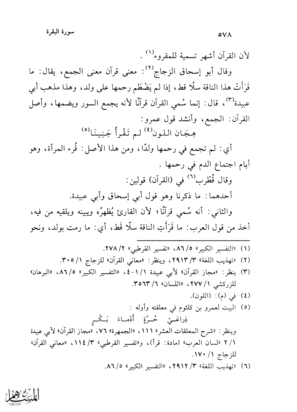 وقال أبو إسحاق الزجاج (¬2): معنى قرآن معنى الجمع، يقال: ما قَرَأَتْ هذا الناقة سلًا قط، إذا لم يَضْطَم رحمها على ولد، وهذا مذهب أبي عبيدة (¬3)، قال: إنما سُمي القرآن قرآنًا لأنه يجمع السور ويضمها، وأصل القرآن: الجمع، وأنشد قول عمرو: