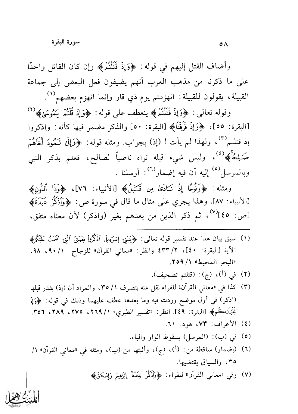 وقوله تعالى: {وَإِذ قَتَلتُم} ينعطف على قوله: {وَإِذ قَلتُم يَامُوسَى} (¬2) [البقرة: 55]، {وَإِذ فَرَقنَا} [البقرة: 50] والذكر مضمر فيها كأنه: واذكروا إذ قتلتم (¬3)، ولهذا لم يأت لـ (إذ) بجواب. ومثله قوله: {وَإِلَى ثَمُودَ أَخَاهُمْ صَالِحًا} (¬4)، وليس شيء قبله تراه ناصباً لصالح، فعلم بذكر النبي وبالمرسل (¬5) إليه أن فيه إضمار (¬6): أرسلنا.