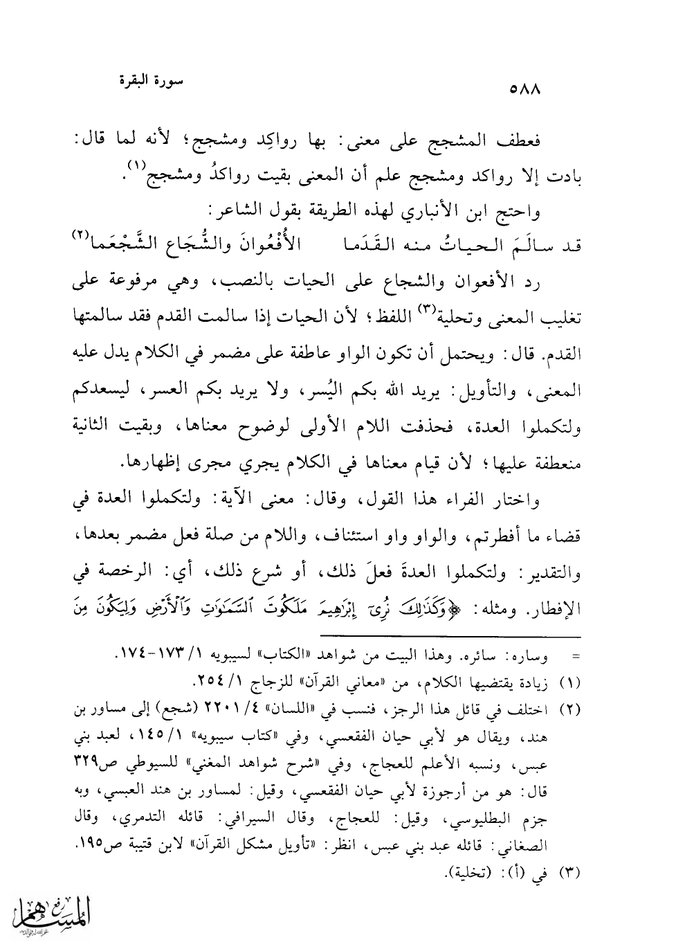 رد الأفعوان والشجاع على الحيات بالنصب، وهي مرفوعة على تغليب المعنى وتحلية (¬3) اللفظ؛ لأن الحيات إذا سالمت القدم فقد سالمتها القدم. قال: ويحتمل أن تكون الواو عاطفة على مضمر في الكلام يدل عليه المعنى، والتأويل: يريد الله بكم اليُسر، ولا يريد بكم العسر، ليسعدكم ولتكملوا العدة، فحذفت اللام الأولى لوضوح معناها، وبقيت الثانية منعطفة عليها؛ لأن قيام معناها في الكلام يجري مجرى إظهارها.