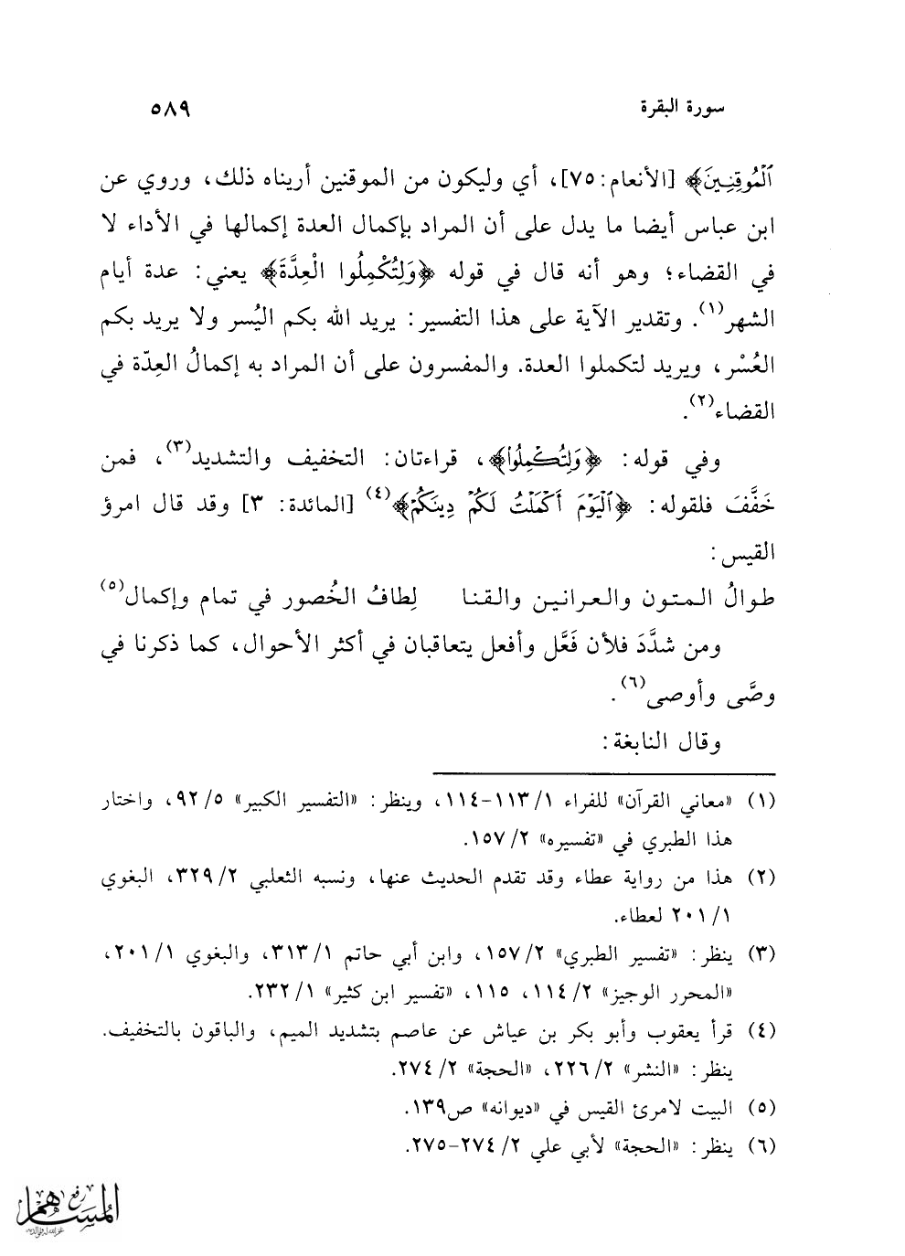 وفي قوله: {وَلِتُكْمِلُوا}، قراءتان: التخفيف والتشديد (¬3)، فمن خَفَّفَ فلقوله: {الْيَوْمَ أَكْمَلْتُ لَكُمْ دِينَكُمْ} (¬4) [المائدة: 3]، وقد قال امرؤ القيس: