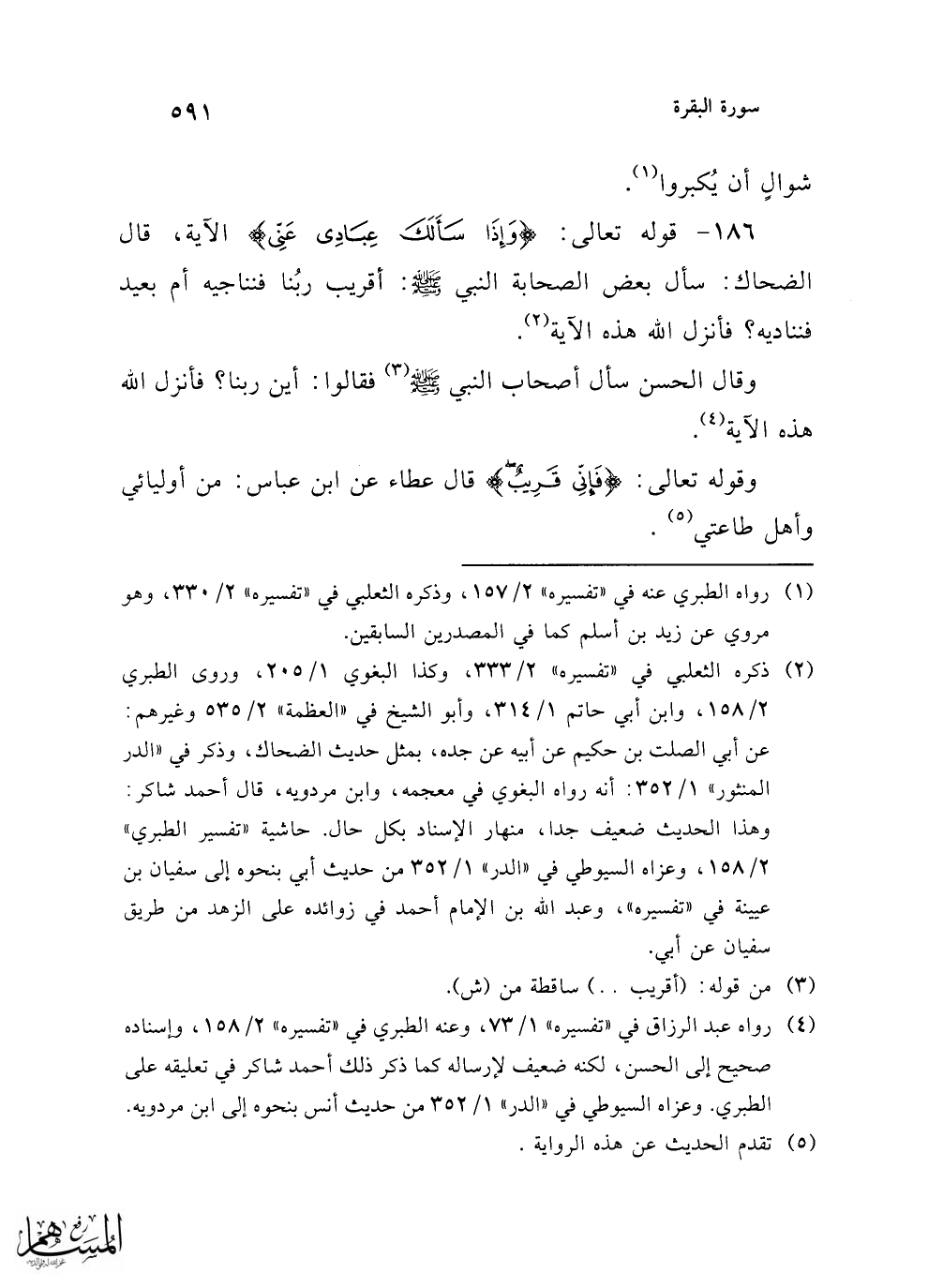 186 - قوله تعالى: {وَإِذَا سَأَلَكَ عِبَادِي عَنِّي} الآية، قال الضحاك: سأل بعض الصحابة النبي - صلى الله عليه وسلم -: أقريب ربُنا فنناجيه أم بعيد فنناديه؟ فأنزل الله هذه الآية (¬2).
