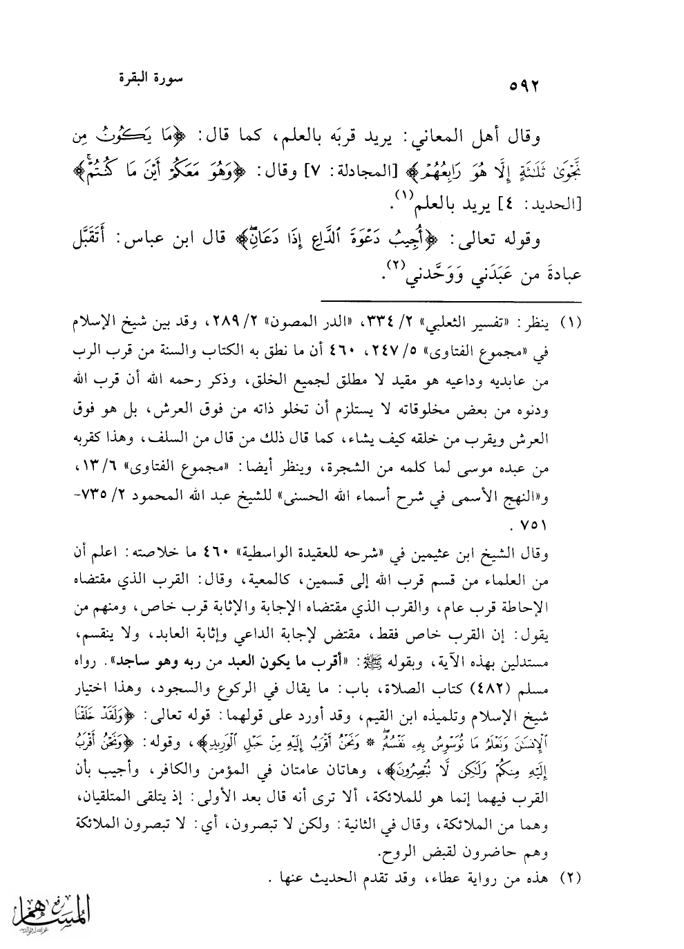 (¬1) ينظر: "تفسير الثعلبي" 2/ 334، "الدر المصون" 2/ 289، وقد بين شيخ الإسلام في "مجموع الفتاوى" 5/ 247، 460 أن ما نطق به الكتاب والسنة من قرب الرب من عابديه وداعيه هو مقيد لا مطلق لجميع الخلق، وذكر رحمه الله أن قرب الله ودنوه من بعض مخلوقاته لا يستلزم أن تخلو ذاته من فوق العرش، بل هو فوق العرش ويقرب من خلقه كيف يشاء، كما قال ذلك من قال من السلف، وهذا كقربه من عبده موسى لما كلمه من الشجرة، وينظر أيضا: "مجموع الفتاوى" 6/ 13، و"النهج الأسمى في شرح أسماء الله الحسنى" للشيخ عبد الله المحمود 2/ 735 - 751.