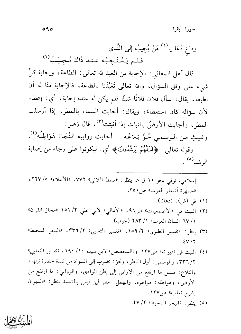 وداعٍ دَعَا يا (¬1) مَنْ يُجِيبُ إلى النَّدى ... فلم يَسْتَجِبْه عندَ ذَاك مُجِيْبُ (¬2)