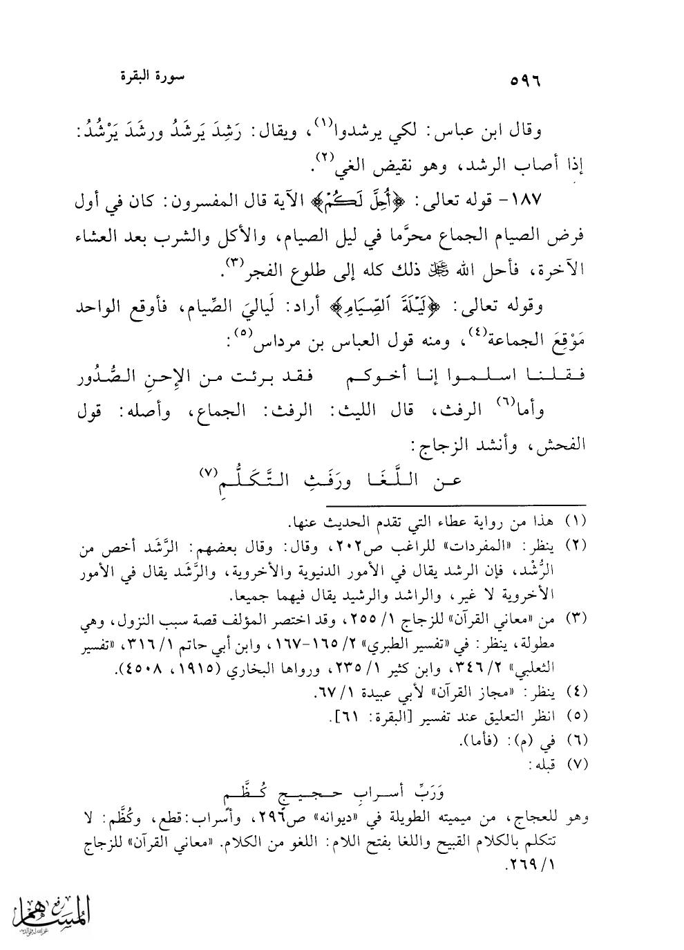 187 - قوله تعالى: {أُحِلَّ لَكُمْ} الآية قال المفسرون: كان في أول فرض الصيام الجماع محرَّما في ليل الصيام، والأكل والشرب بعد العشاء الآخرة، فأحل الله عز وجل ذلك كله إلى طلوع الفجر (¬3).
