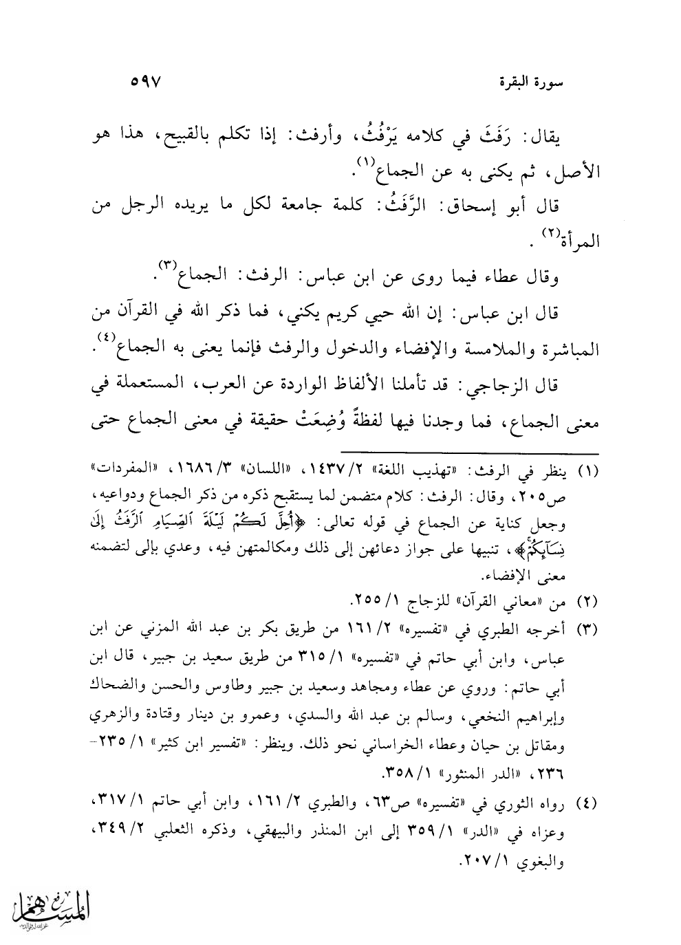 (¬1) ينظر في الرفث؛ "تهذيب اللغة" 2/ 1437، "اللسان" 3/ 1686، "المفردات" ص 205، وقال: الرفث: كلام متضمن لما يستقبح ذكره من ذكر الجماع ودواعيه، وجعل كناية عن الجماع في قوله تعالى: {أُحِلَّ لَكُمْ لَيْلَةَ الصِّيَامِ الرَّفَثُ إِلَى نِسَائِكُمْ}، تنبيها على جواز دعائهن إلى ذلك ومكالمتهن فيه، وعدي بإلى لتضمنه معنى الإفضاء.