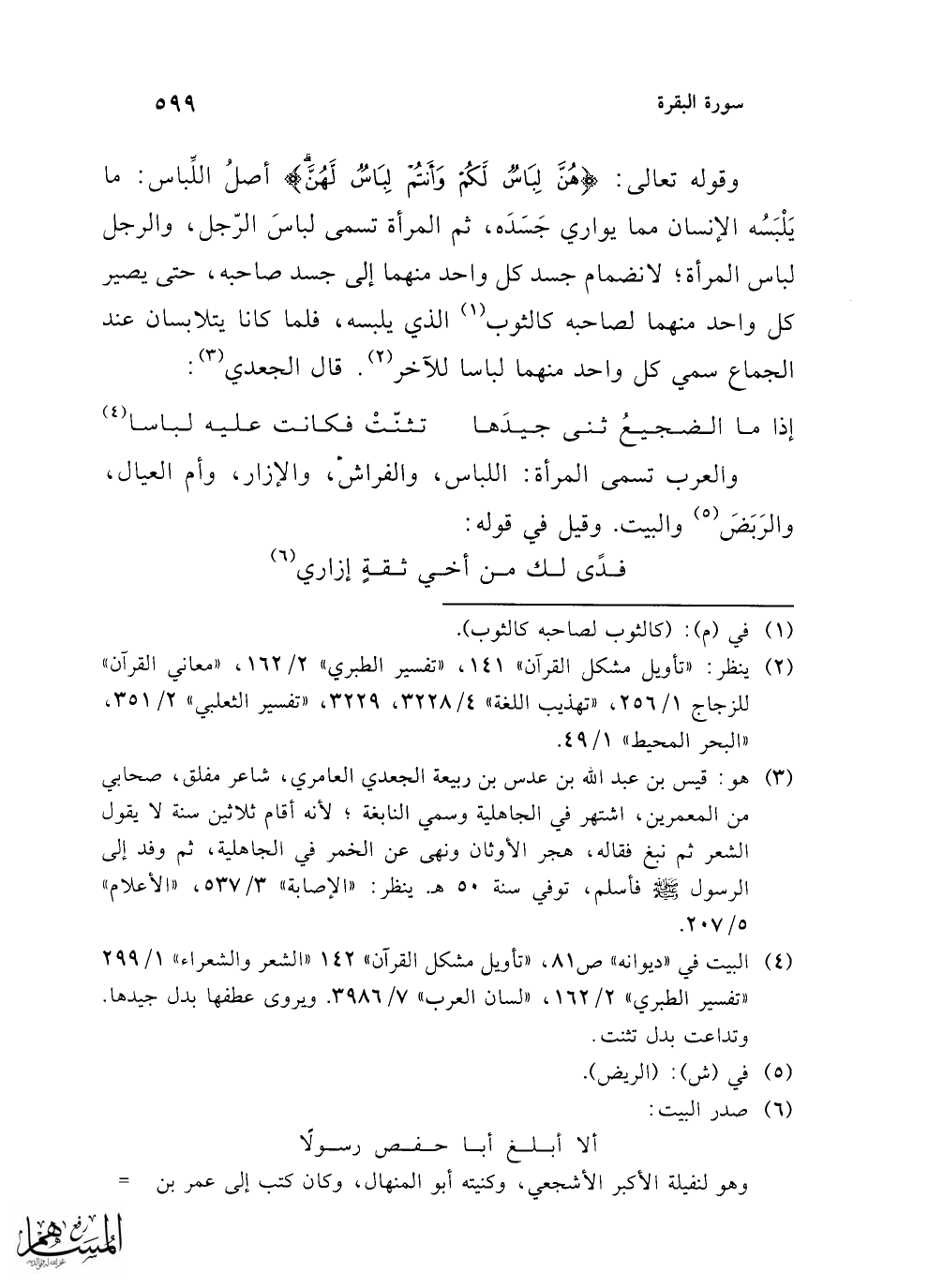 وقوله تعالى: {هُنَّ لِبَاسٌ لَكُمْ وَأَنْتُمْ لِبَاسٌ لَهُنَّ} أصلُ اللِّباس: ما يَلْبَسُه الإنسان مما يواري جَسَدَه، ثم المرأة تسمى لباسَ الرّجل، والرجل لباس المرأة؛ لانضمام جسد كل واحد منهما إلى جسد صاحبه، حتى يصير كل واحد منهما لصاحبه كالثوب (¬1) الذي يلبسه، فلما كانا يتلابسان عند الجماع سمي كل واحد منهما لباسا للآخر (¬2). قال الجعدي (¬3):