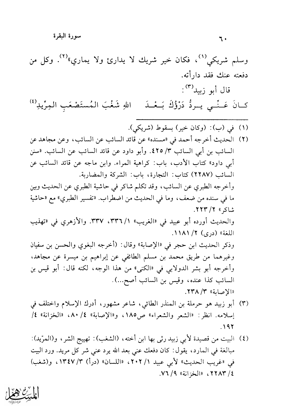 (¬4) البيت من قصيدة لأبي زبيد رثى بها ابن أخته، (الشغب): تهييج الشر، و (المرّيد): مبالغة في المارد، يقول: كان دفعك عني بعد الله يرد عني شر كل مريد. ورد البيت في "غريب الحديث" لأبي عبيد 1/ 202، "اللسان" (درأ) 3/ 1347، و (شغب) 4/ 2283، "الخزانة" 9/ 76.