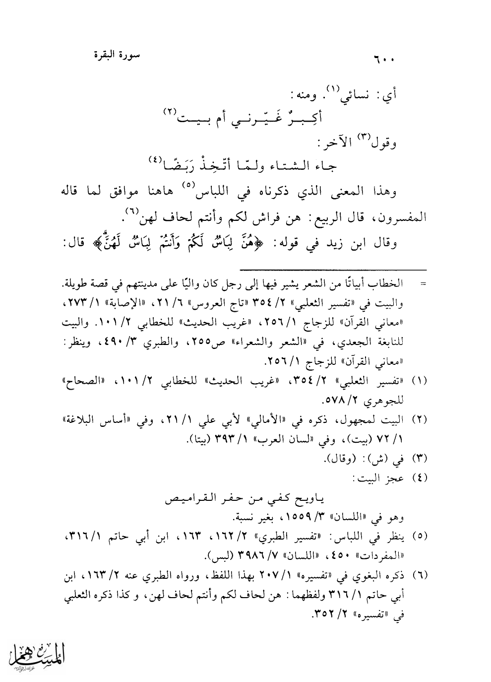 (¬5) ينظر في اللباس: "تفسير الطبري" 2/ 162، 163، ابن أبي حاتم 1/ 316، "المفردات" 450، " اللسان" 7/ 3986 (لبس).