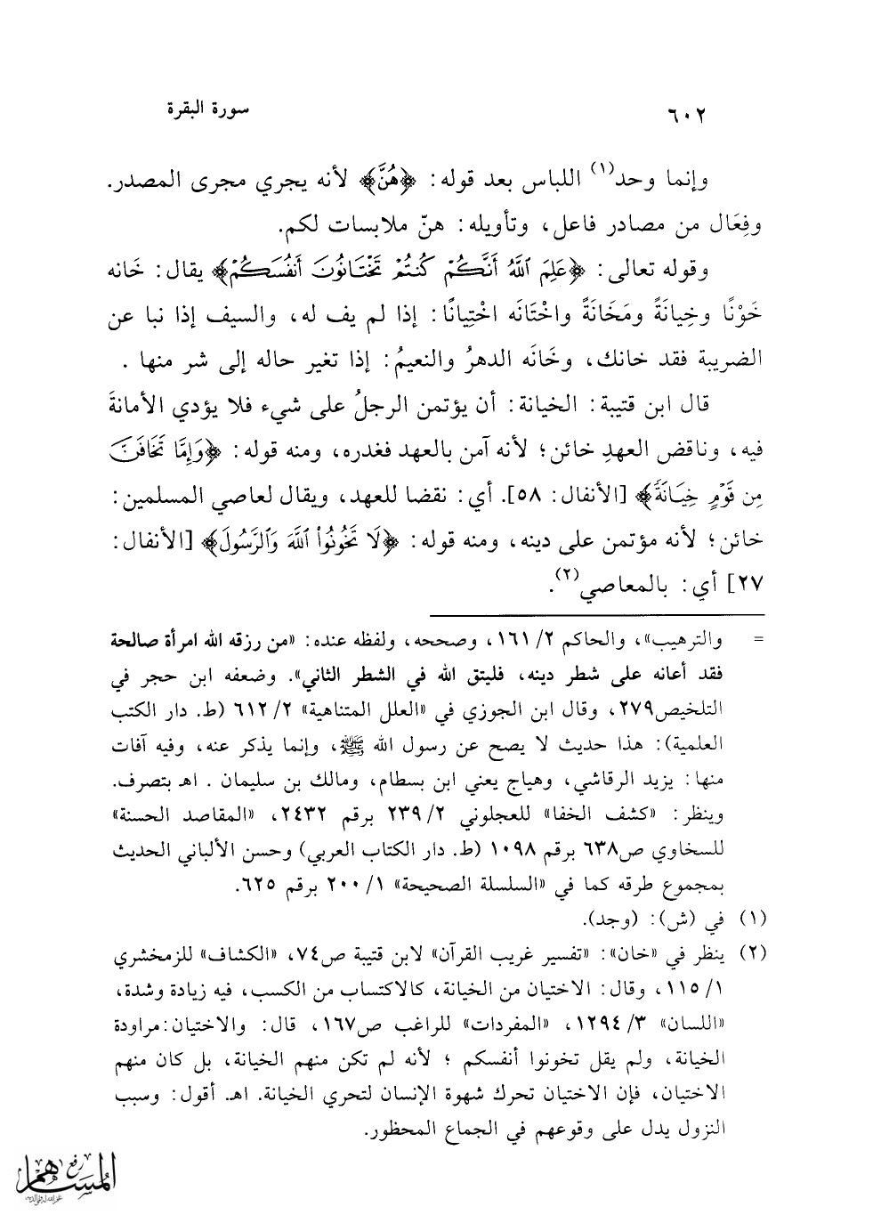 (¬2) ينظر في "خان": "تفسير غريب القرآن" لابن قتيبة ص 74، "الكشاف" للزمخشري 1/ 115، وقال: الاختيان من الخيانة، كالاكتساب من الكسب، فيه زيادة وشدة، "اللسان" 3/ 1294، "المفردات" للراغب ص 167، قال: والاختيان: مراودة الخيانة، ولم يقل تخونوا أنفسكم؛ لأنه لم تكن منهم الخيانة، بل كان منهم الاختيان، فإن الاختيان تحرك شهوة الإنسان لتحري الخيانة. اهـ. أقول: وسبب النزول يدل على وقوعهم في الجماع المحظور.