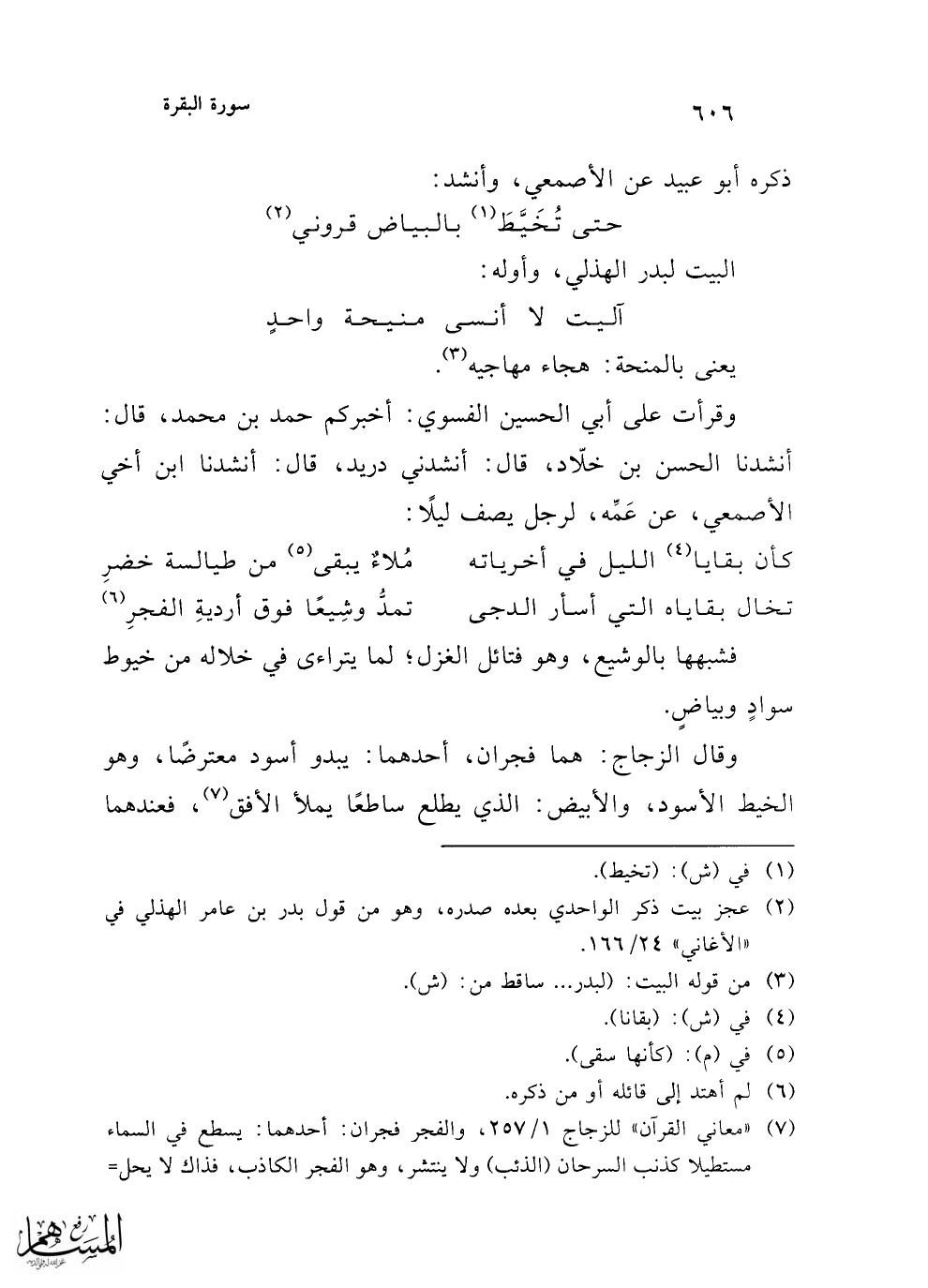 (¬7) "معاني القرآن" للزجاج 1/ 257، والفجر فجران: أحدهما: يسطع في السماء مستطيلا كذنب السرحان (الذئب) ولا ينتشر، وهو الفجر الكاذب، فذاك لا يحل=