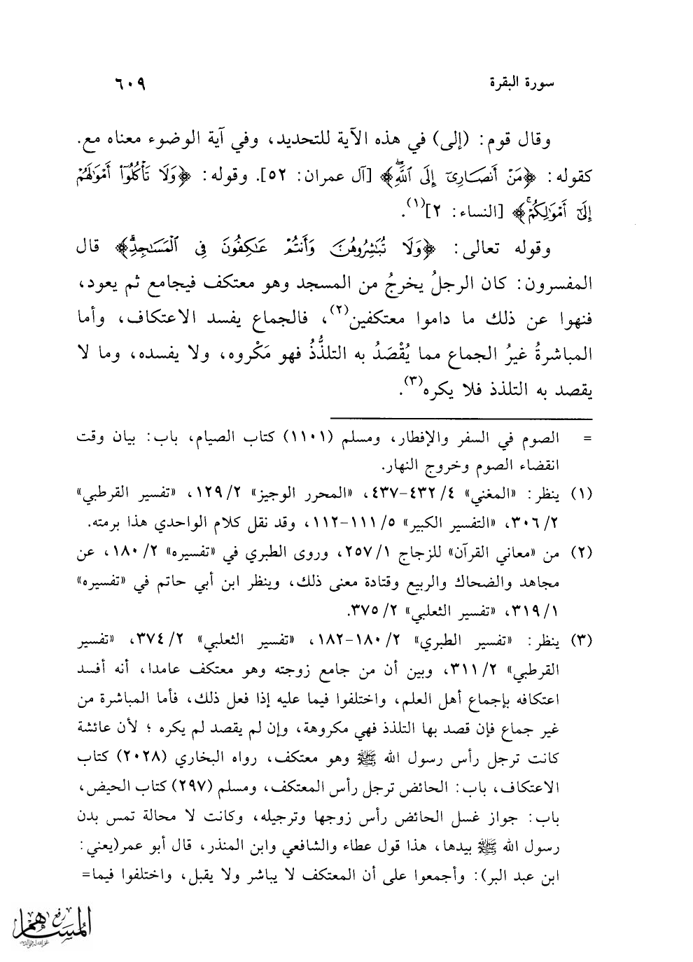 (¬3) ينظر: "تفسير الطبري" 2/ 180 - 182، "تفسير الثعلبي" 2/ 374، "تفسير القرطبي" 2/ 311، وبين أن من جامع زوجته وهو معتكف عامدا، أنه أفسد اعتكافه بإجماع أهل العلم، واختلفوا فيما عليه إذا فعل ذلك، فأما المباشرة من غير جماع فإن قصد بها التلذذ فهي مكروهة، وان لم يقصد لم يكره، لأن عائشة كانت ترجل رأس رسول الله - صلى الله عليه وسلم - وهو معتكف، رواه البخاري (2028) كتاب الاعتكاف، باب: الحائض ترجل رأس المعتكف، ومسلم (297) كتاب الحيض، باب: جواز غسل الحائض رأس زوجها وترجيله، وكانت لا محالة تمس بدن رسول الله - صلى الله عليه وسلم - بيدها، هذا قول عطاء والشافعي وابن المنذر، قال أبو عمر (يعني: ابن عبد البر): وأجمعوا على أن المعتكف لا يباشر ولا يقبل، واختلفوا فيما =