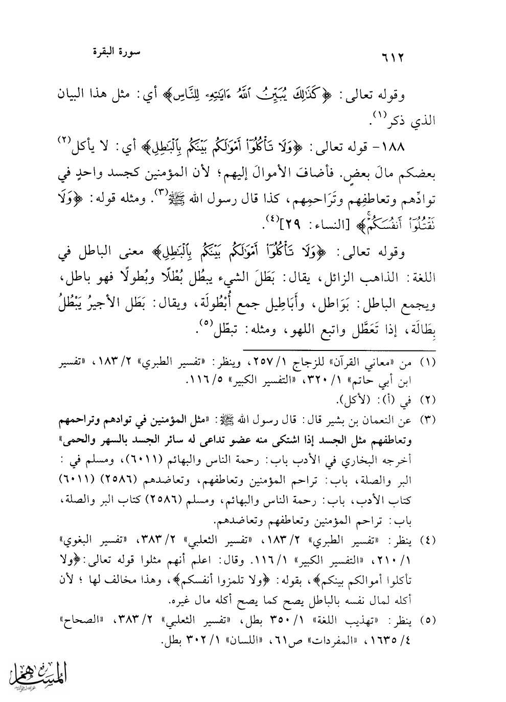 188 - قوله تعالى: {وَلَا تَأْكُلُوا أَمْوَالَكُمْ بَيْنَكُمْ بِالْبَاطِلِ} أي: لا يأكل (¬2) بعضكم مالَ بعضٍ. فأضافَ الأموالَ إليهم؛ لأن المؤمنين كجسد واحدٍ في توادِّهم وتعاطفِهم وتَرَاحمِهم، كذا قال رسول الله - صلى الله عليه وسلم - (¬3). ومثله قوله: {وَلَا تَقْتُلُوا أَنْفُسَكُمْ} [النساء: 29] (¬4).