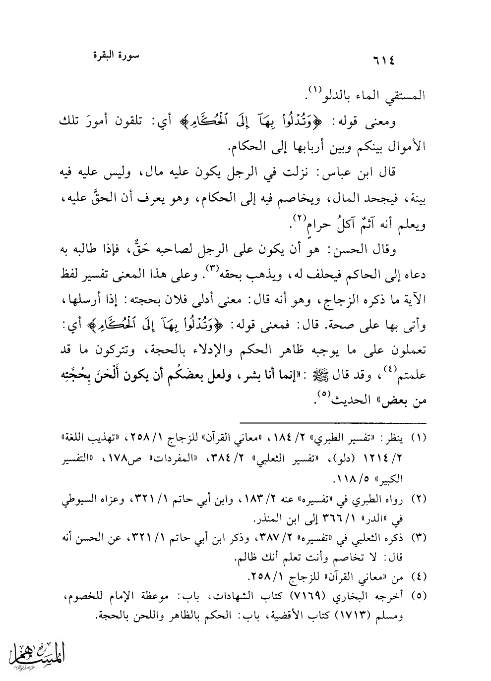 وقال الحسن: هو أن يكون على الرجل لصاحبه حَقٌّ، فإذا طالبه به دعاه إلى الحاكم فيحلف له، ولذهب بحقه (¬3). وعلى هذا المعنى تفسير لفظ الآية ما ذكره الزجاج، وهو أنه قال: معنى أدلى فلان بحجته: إذا أرسلها، وأتى بها على صحة. قال: فمعنى قوله: {وَتُدْلُوا بِهَا إِلَى الْحُكَّامِ} أي: تعملون على ما يوجبه ظاهر الحكم والإدلاء بالحجة، وتتركون ما قد علمتم (¬4)، وقد قال - صلى الله عليه وسلم -: "إنما أنا بشر، ولعل بعضَكُم أن يكون أَلْحَنَ بِحُجَّتِه من بعض" الحديث (¬5).