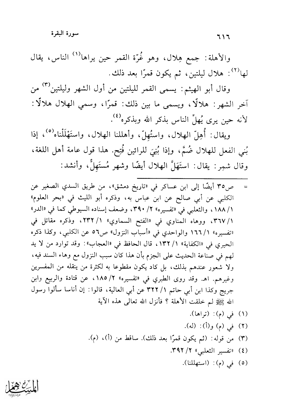= ص 35 أيضًا إلى ابن عساكر في "تاريخ دمشق"، من طريق السدي الصغير عن الكلبي عن أبي صالح عن ابن عباس به، وذكره أبو الليث في "بحر العلوم" 1/ 188، والثعلبي في "تفسيره" 2/ 390، وضعف إسناده السيوطي كما في "الدر" 1/ 367، ووهاه المناوي في "الفتح السماوي" 1/ 232، وذكره مقاتل في "تفسيره" 1/ 166 والواحدي في "أسباب النزول" ص 56 عن الكلبي، وكذا ذكره الحيري في "الكفاية" 1/ 132، قال الحافظ في "العجاب": وقد توارد من لا يد لهم في صناعة الحديث على الجزم بأن هذا كان سبب النزول مع وهاء السند فيه، ولا شعور عندهم بذلك، بل كاد يكون مقطوعا به لكثرة من ينقله من المفسرين وغيرهم. اهـ. وقد روى الطبري في "تفسيره" 2/ 185، عن قتادة والربيع وابن جريج وكذا ابن أبي حاتم 1/ 322 عن أبي العالية، قالوا: إن أناسا سألوا رسول الله - صلى الله عليه وسلم - لم خلقت الأهلة؟ فانزل الله تعالى هذه الآية