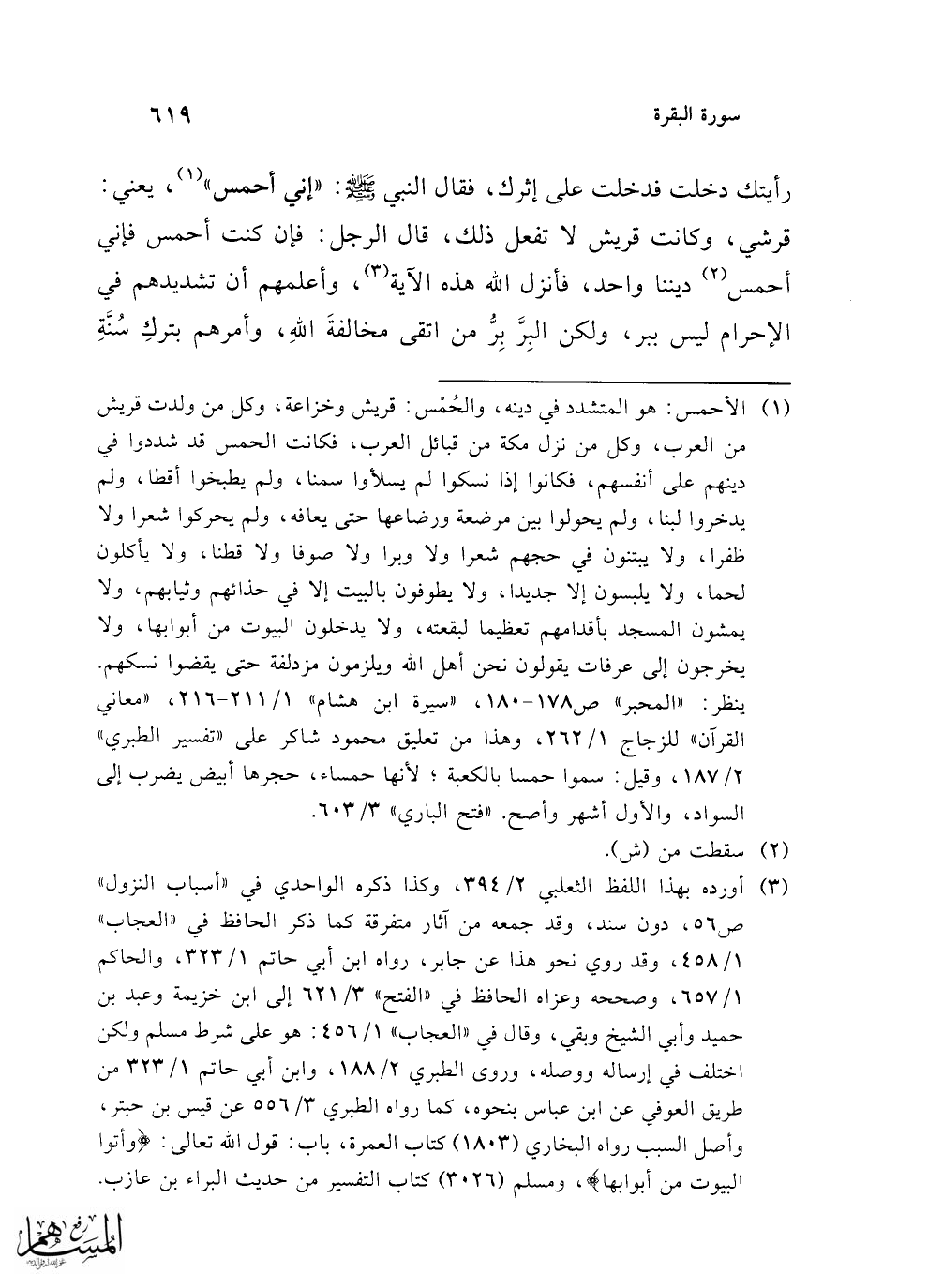 (¬1) الأحمس: هو المتشدد في دينه، والحُمْس: قريش وخزاعة، وكل من ولدت قريش من العرب، وكل من نزل مكة من قبائل العرب، فكانت الحمس قد شددوا في دينهم على أنفسهم، فكانوا إذا نسكوا لم يسلأوا سمنا، ولم يطبخوا أقطا، ولم يدخروا لبنا، ولم يحولوا بين مرضعة ورضاعها حتى يعافه، ولم يحركوا شعرا ولا ظفرا، ولا يبتنون في حجهم شعرا ولا وبرا ولا صوفا ولا قطنا، ولا يأكلون لحما، ولا يلبسون إلا جديدا، ولا يطوفون بالبيت إلا في حذائهم وثيابهم، ولا يمشون المسجد بأقدامهم تعظيما لبقعته، ولا يدخلون البيوت من أبوابها، ولا يخرجون إلى عرفات يقولون نحن أهل الله ويلزمون مزدلفة حتى يقضوا نسكهم. ينظر: "المحبر" ص178 - 180، "سيرة ابن هشام" 1/ 211 - 216، "معاني القرآن" للزجاج 1/ 262، وهذا من تعليق محمود شاكر على "تفسير الطبري" 2/ 187، وقيل: سموا حمسا بالكعبة؛ لأنها حمساء، حجرها أبيض يضرب إلى السواد، والأول أشهر وأصح. "فتح الباري" 3/ 603.