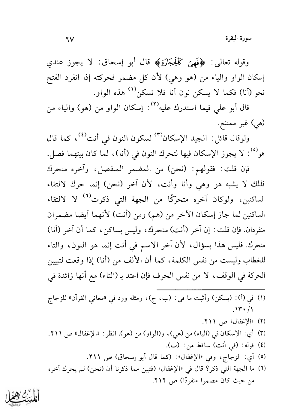 وقوله تعالى: {فَهِيَ كَالْحِجَارَةِ} قال أبو إسحاق: لا يجوز عندي إسكان الواو والياء من (هو وهي) لأن كل مضمر فحركته إذا انفرد الفتح نحو (أنا) فكما لا يسكن نون أنا فلا تسكن (¬1) هذه الواو.