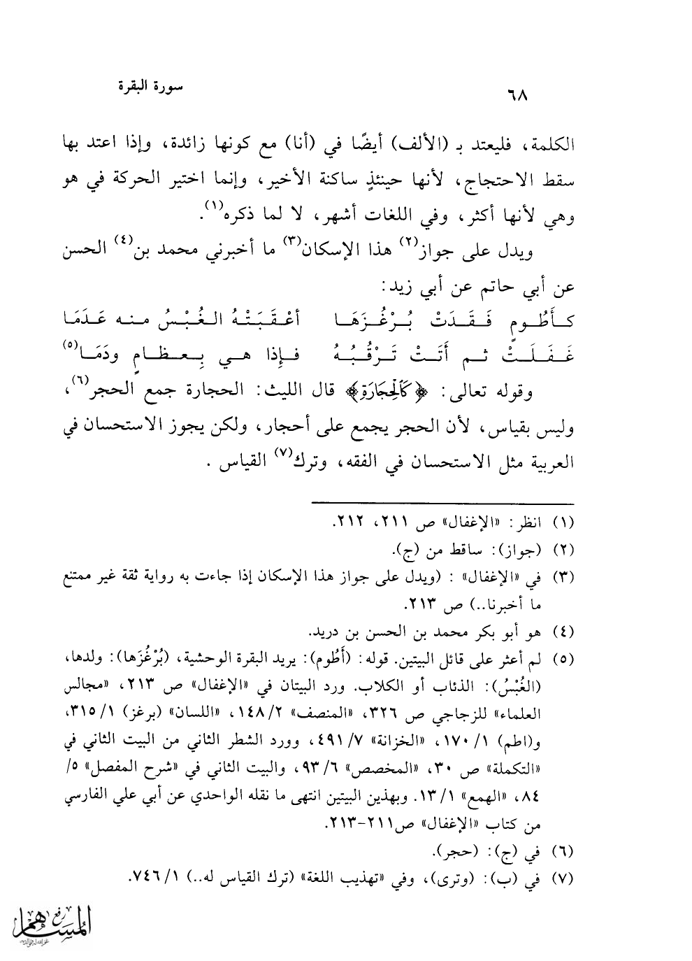 (¬5) لم أعثر على قائل البيتين. قوله: (أَطُوم): يريد البقرة الوحشية، (بُرْغُزَها): ولدها، (الغُبْسُ): الذئاب أو الكلاب. ورد البيتان في "الإغفال" ص 213، "مجالس العلماء" للزجاجي ص 326، "المنصف" 2/ 148، "اللسان" (برغز) 1/ 315، و (اطم) 1/ 170، "الخزانة" 7/ 491، وورد الشطر الثاني من البيت الثاني في "التكملة" ص 30، "المخصص" 6/ 93، والبيت الثاني في "شرح المفصل" 5/ 84، "الهمع" 1/ 13. وبهذين البيتين انتهى ما نقله الواحدي عن أبي علي الفارسي من كتاب "الإغفال" ص 211 - 213.