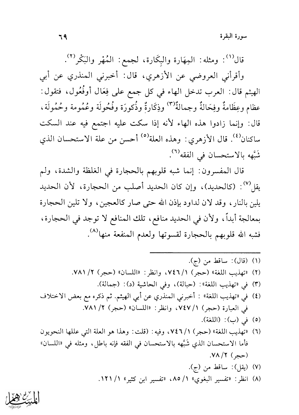 وأقرأني العروضي عن الأزهري، قال: أخبرني المنذري عن أبي الهيثم قال: العرب تدخل الهاء في كل جمع على فِعَال أو فُعُول، فتقول: عظام وعِظَامةٌ وفِحَالةٌ وجمالةٌ (¬3) وذِكَارةٌ وذُكورَة وفُحُولَة وعُمُومة وحُمُولَة، قال: وإنما زادوا هذه الهاء لأنه إذا سكت عليه اجتمع فيه عند السكت ساكنان (¬4). قال الأزهري: وهذه العلة (¬5) أحسن من علة الاستحسان الذي شَبَّهه بالاستحسان في الفقه (¬6).