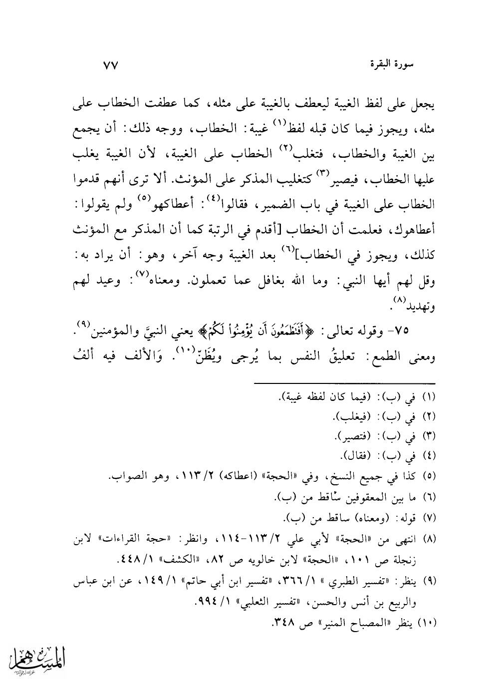 75 - وقوله تعالى: {أَفَتَطْمَعُونَ أَنْ يُؤْمِنُوا لَكُمْ} يعني النبيَّ والمؤمنين (¬9). ومعنى الطمع: تعليقُ النفس بما يُرجى ويُظَنّ (¬10). وَالألف فيه ألفُ