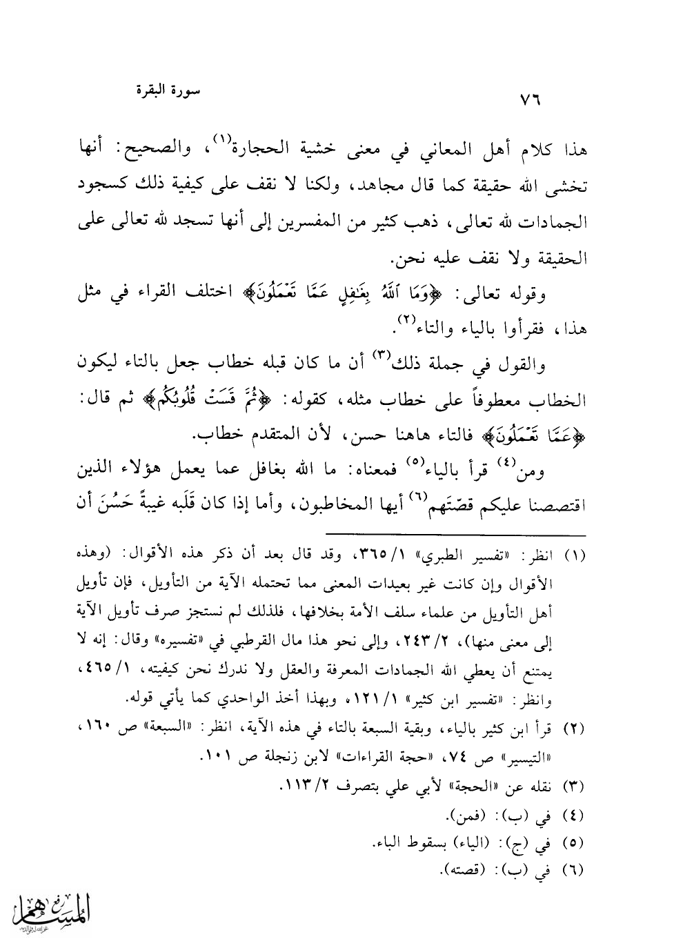 (¬1) انظر: "تفسير الطبري" 1/ 365، وقد قال بعد أن ذكر هذه الأقوال: (وهذه الأقوال وإن كانت غير بعيدات المعنى مما تحتمله الآية من التأويل، فإن تأويل أهل التأويل من علماء سلف الأمة بخلافها، فلذلك لم نستجز صرف تأويل الآية إلى معنى منها)، 2/ 243، وإلى نحو هذا مال القرطبي في "تفسيره" وقال: إنه لا يمتنع أن يعطي الله الجمادات المعرفة والعقل ولا ندرك نحن كيفيته، 1/ 465، وانظر: "تفسير ابن كثير" 1/ 121، وبهذا أخذ الواحدي كما يأتي قوله.
