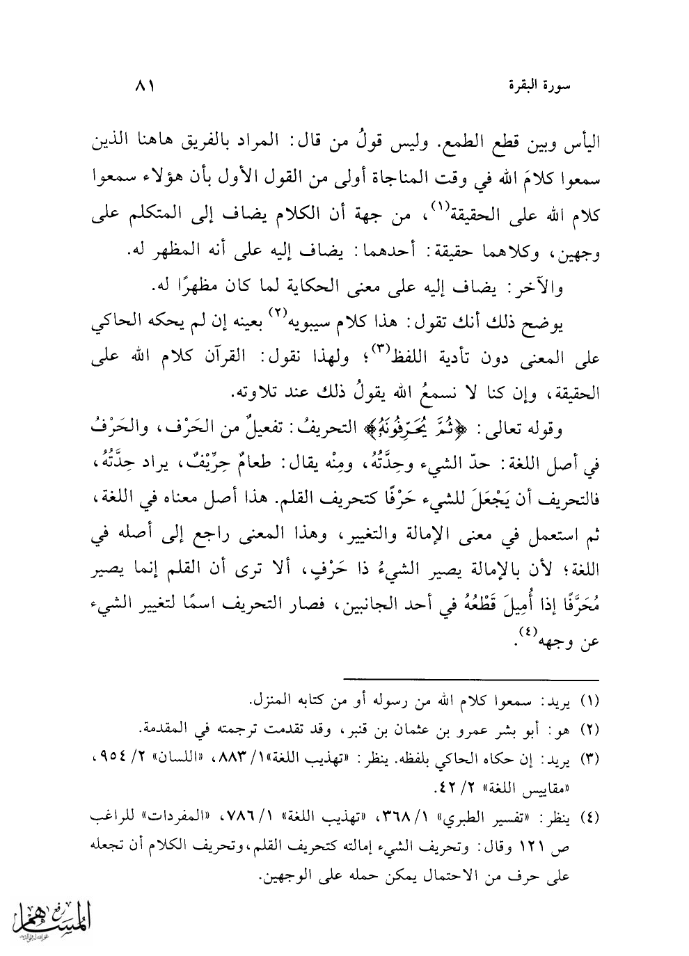 اليأس وبين قطع الطمع. وليس قولُ من قال: المراد بالفريق هاهنا الذين سمعوا كلامَ الله في وقت المناجاة أولى من القول الأول بأن هؤلاء سمعوا كلام الله على الحقيقة (¬1)، من جهة أن الكلام يضاف إلى المتكلم على وجهين، وكلاهما حقيقة: أحدهما: يضاف إليه على أنه المظهر له.