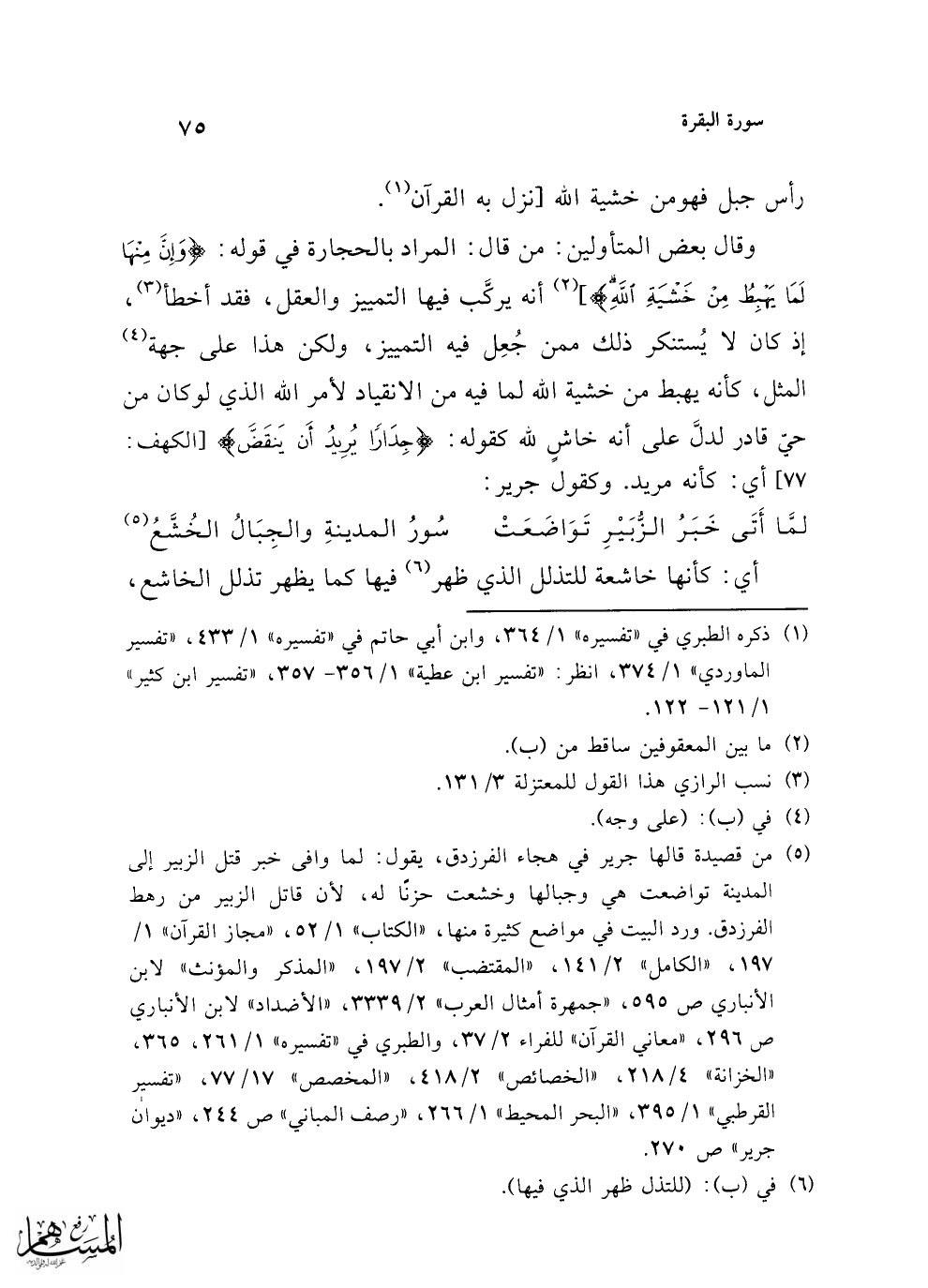 وقال بعض المتأولين: من قال: المراد بالحجارة في قوله: {وَإِنَّ مِنْهَا لَمَا يَهْبِطُ مِنْ خَشْيَةِ اللَّهِ}] (¬2) أنه يركَّب فيها التمييز والعقل، فقد أخطأ (¬3)، إذ كان لا يُستنكر ذلك ممن جُعِل فيه التمييز، ولكن هذا على جهة (¬4) المثل، كأنه يهبط من خشية الله لما فيه من الانقياد لأمر الله الذي لو كان من حيّ قادر لدلَّ على أنه خاشٍ لله كقوله: {جِدَارًا يُرِيدُ أَنْ يَنْقَضَّ} [الكهف: 77]، أي: كأنه مريد. وكقول جرير: