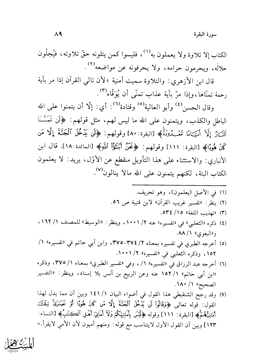 وقال الحسن (¬4) وأبو العالية (¬5) وقتادة (¬6): أي: إلّا أن يتمنوا على الله الباطل والكذب، ويتمنون على الله ما ليس لهم، مثل قولهم: {وَقَالُوا لَنْ تَمَسَّنَا النَّارُ إِلَّا أَيَّامًا مَعْدُودَةً} [البقرة: 80]، وقولهم: {وَقَالُوا لَنْ يَدْخُلَ الْجَنَّةَ إِلَّا مَنْ كَانَ هُودًا} [البقرة: 111]، وقولهم: {نَحْنُ أَبْنَاءُ اللَّهِ} [المائدة: 18]. قال ابن الأنباري: والاستثناء على هذا التأويل منقطع عن الأوّل، يريد. لا يعلمون الكتاب البتة، لكنهم يتمنون على الله مالا ينالون (¬7).
