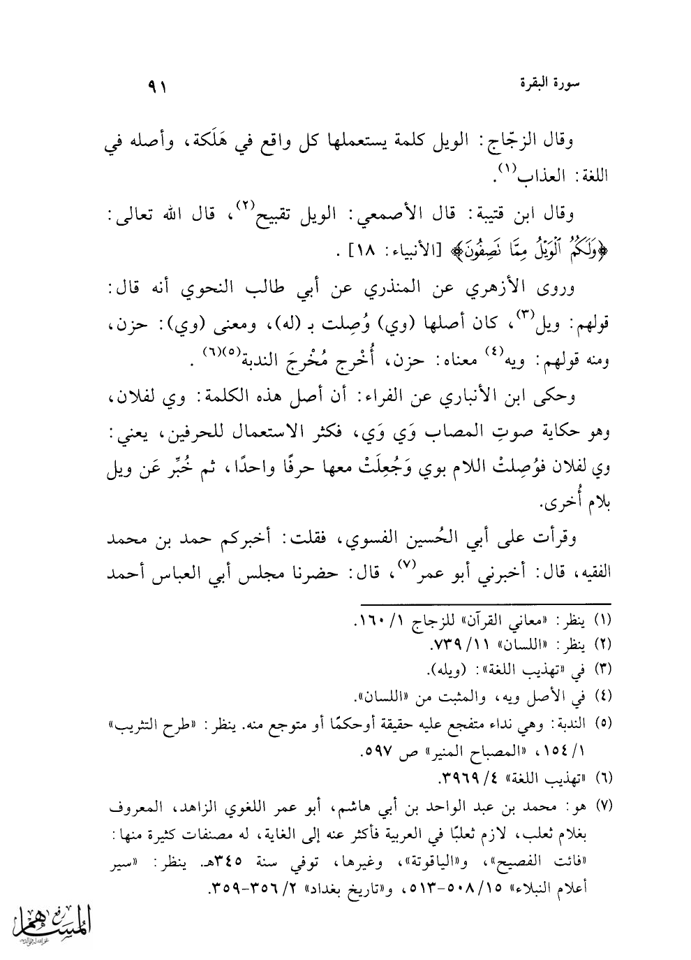وقال ابن قتيبة: قال الأصمعي: الويل تقبيح (¬2)، قال الله تعالى: {وَلَكُمُ الْوَيْلُ مِمَّا تَصِفُونَ} [الأنبياء: 18].