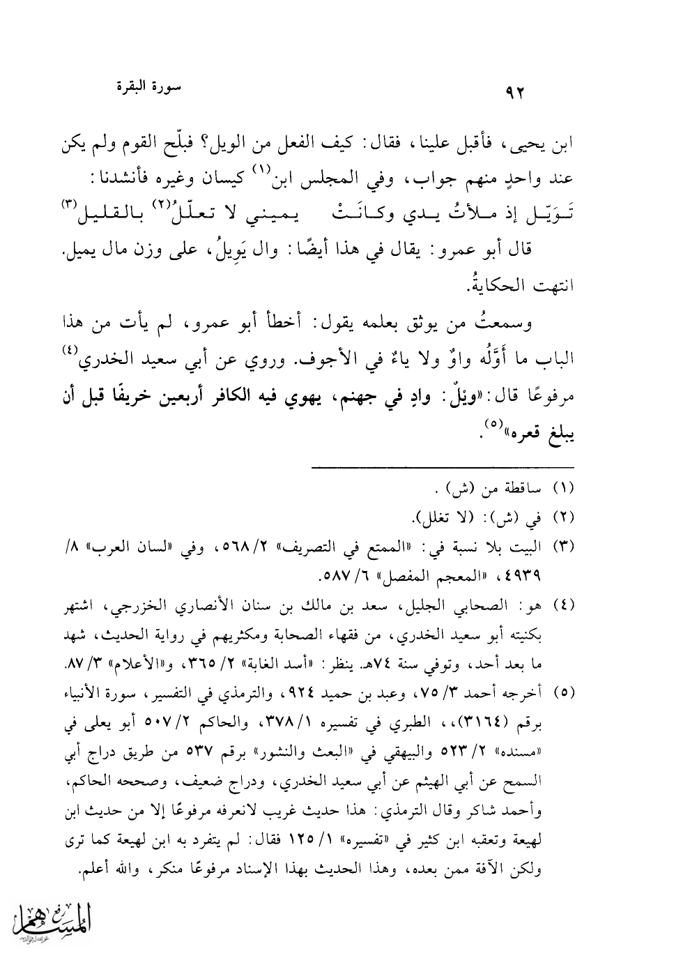 وسمعتُ من يوثق بعلمه يقول: أخطأ أبو عمرو، لم يأت من هذا الباب ما أَوَّلُه واوٌ ولا ياءٌ في الأجوف. وروي عن أبي سعيد الخدري (¬4) مرفوعًا قال: "ويْلٌ: وادٍ في جهنم، يهوي فيه الكافر أربعين خريفًا قبل أن يبلغ قعره" (¬5).