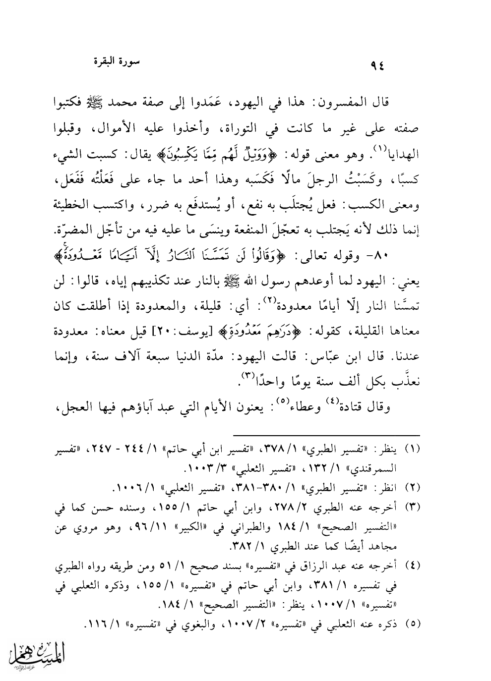 (¬4) أخرجه عنه عبد الرزاق في "تفسيره" بسند صحيح 1/ 51 ومن طريقه رواه الطبري في تفسيره 1/ 381، وابن أبي حاتم في "تفسيره" 1/ 155، وذكره الثعلبي في "تفسيره" 1/ 1007، ينظر: "التفسير الصحيح" 1/ 184.