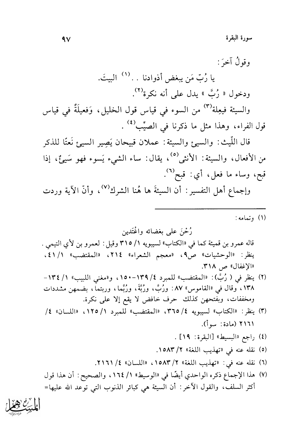 (¬3) ينظر: "الكتاب" لسيبويه 4/ 365، "المقتضب" للمبرد 1/ 125، "اللسان" 4/ 2161 (مادة: سوأ).