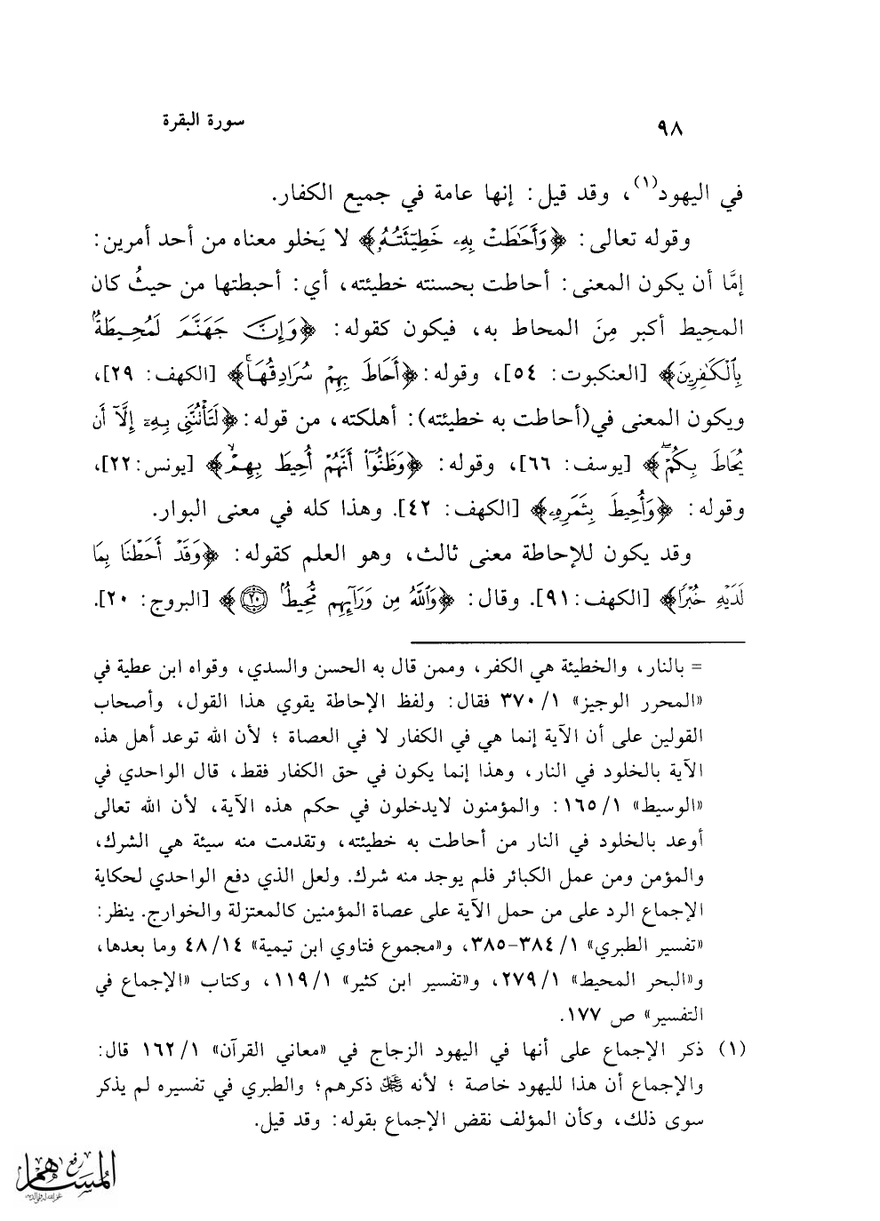 = بالنار، والخطيئة هي الكفر، وممن قال به الحسن والسدي، وقواه ابن عطية في "المحرر الوجيز" 1/ 370 فقال: ولفظ الإحاطة يقوي هذا القول، وأصحاب القولين على أن الآية إنما هي في الكفار لا في العصاة؛ لأن الله توعد أهل هذه الآية بالخلود في النار، وهذا إنما يكون في حق الكفار فقط، قال الواحدي في "الوسيط" 1/ 165: والمؤمنون لا يدخلون في حكم هذه الآية، لأن الله تعالى أوعد بالخلود في النار من أحاطت به خطيئته، وتقدمت منه سيئة هي الشرك، والمؤمن ومن عمل الكبائر فلم يوجد منه شرك. ولعل الذي دفع الواحدي لحكاية الإجماع الرد على من حمل الآية على عصاة المؤمنين كالمعتزلة والخوارج. ينظر: "تفسير الطبري" 1/ 384 - 385، و"مجموع فتاوي ابن تيمية" 14/ 48 وما بعدها، و"البحر المحيط" 1/ 279، و"تفسير ابن كثير" 1/ 119، وكتاب "الإجماع في التفسير" ص 177.