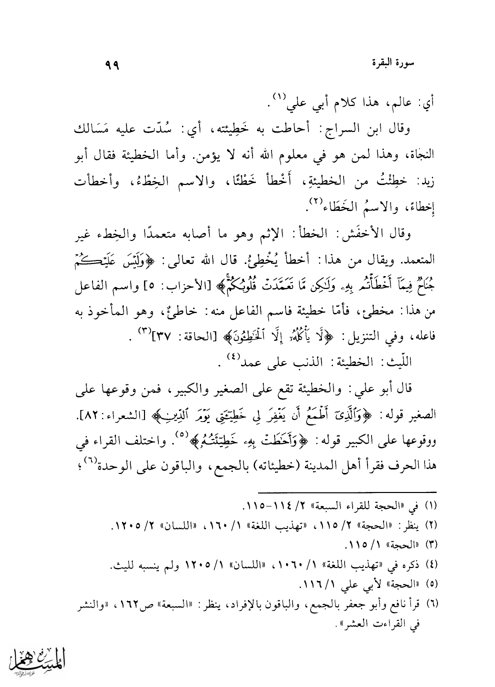 قال أبو علي: والخطيئة تقع على الصغير والكبير، فمن وقوعها على الصغير قوله: {وَالَّذِي أَطْمَعُ أَنْ يَغْفِرَ لِي خَطِيئَتِي يَوْمَ الدِّينِ} [الشعراء: 82]. ووقوعها على الكبير قوله: {وَأَحَاطَتْ بِهِ خَطِيئَتُهُ} (¬5). واختلف القراء في هذا الحرف فقرأ أهل المدينة (خطيئاته) بالجمع، والباقون على الوحدة (¬6)؛