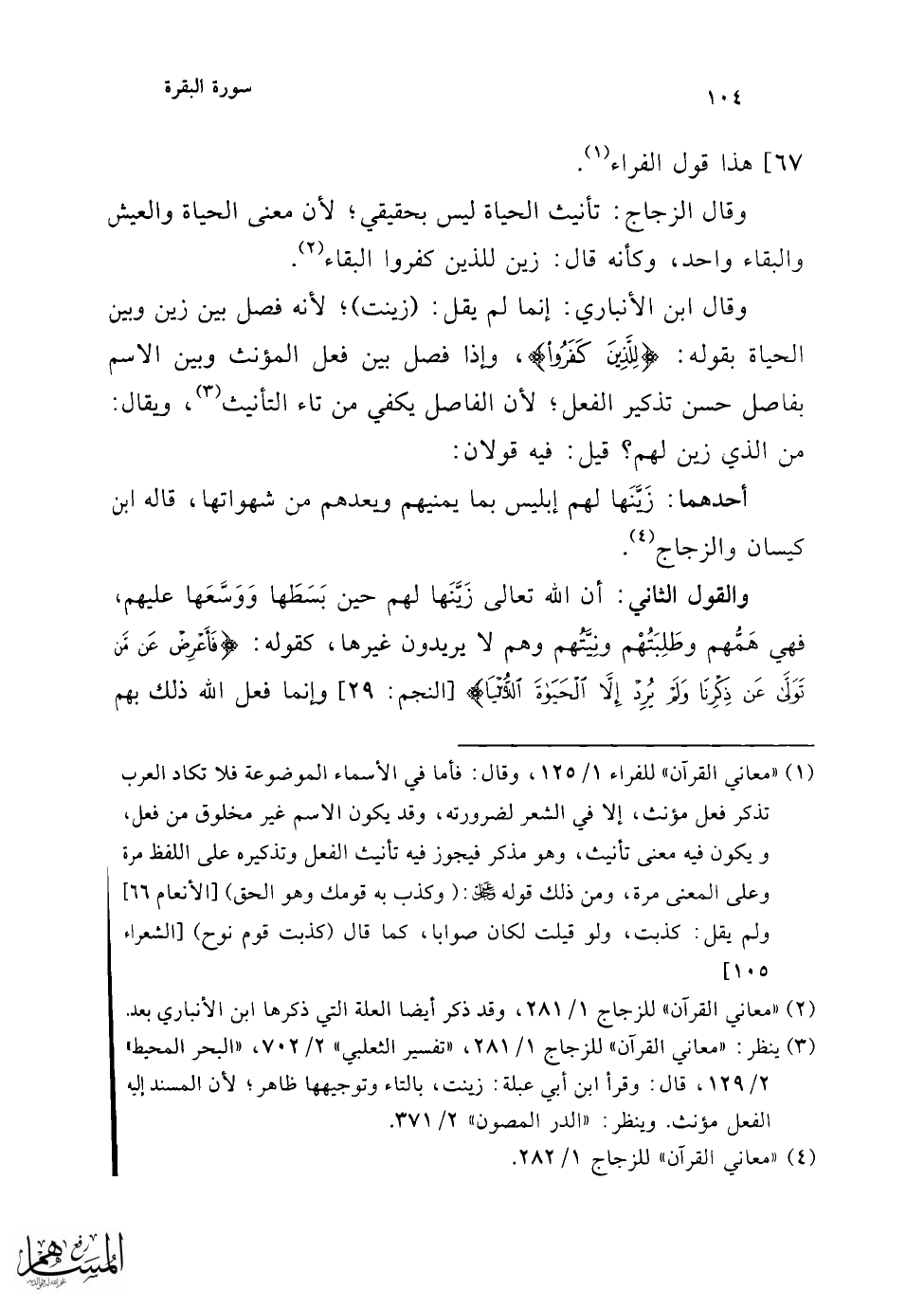 (¬3) ينظر في ذكر الأقوال: "تفسير البغوي" 1/ 242، "المحرر الوجيز" 2/ 203، "البحر المحيط" 2/ 129 قال البغوي: الأكثرون على أن المزين هو الله تعالى، والتزيين من الله تعالى هو أنه خلق الأشياء الحسنة والمناظر العجيبة، فنظر الخلق إليها بأكثر من قدرها فأعجبتهم ففتنوا بها. وقال ابن عطية جامعا بين القولين: المزين هو خالقها ومخترعها وخالق الكفر، ويزينها أيضا الشيطان بوسوسته وإغوائه. وينظر: "زاد المسير" 1/ 228.