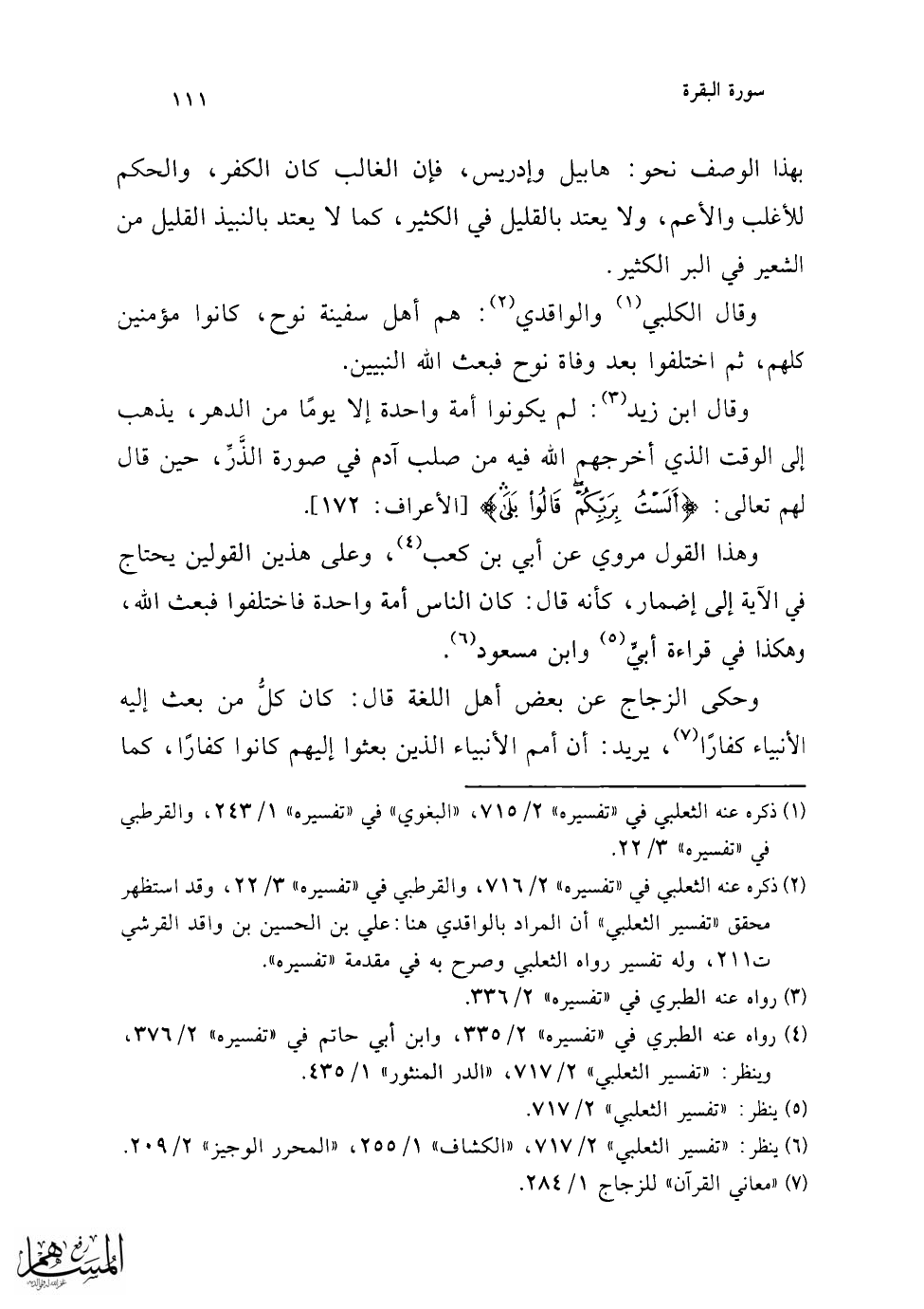 (¬1) ينظر: "السيرة النبوية" لابن هشام، والذي في "تفسير الثعلبي" 2/ 717 - 718، وقال مجاهد ومحمد بن إسحاق بن يسار: كان الناس أمة واحدة، يعني: آدم وحده، سمى الواحد بلفظ الجمع؛ لأنه أصل النسل، ثم خلق الله تعالى حواء ونشر منهما الناس، فكانوا مسلمين كلهم إلى أن قتل هابيل فاختلفوا حينئذ فبعث الله النبيين. وينظر قول مجاهد في "تفسيره" 1/ 104، والطبري في "تفسيره" 2/ 335.