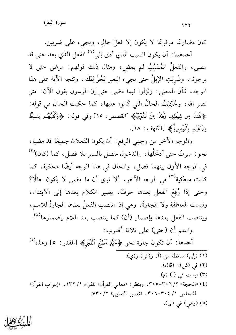 الجارة هي التي تنصب الأفعال بعدها بإضمار أن، والفعل و (أن) المضمرة (معه) (¬1) في موضع جر بـ (حتى) (¬2).