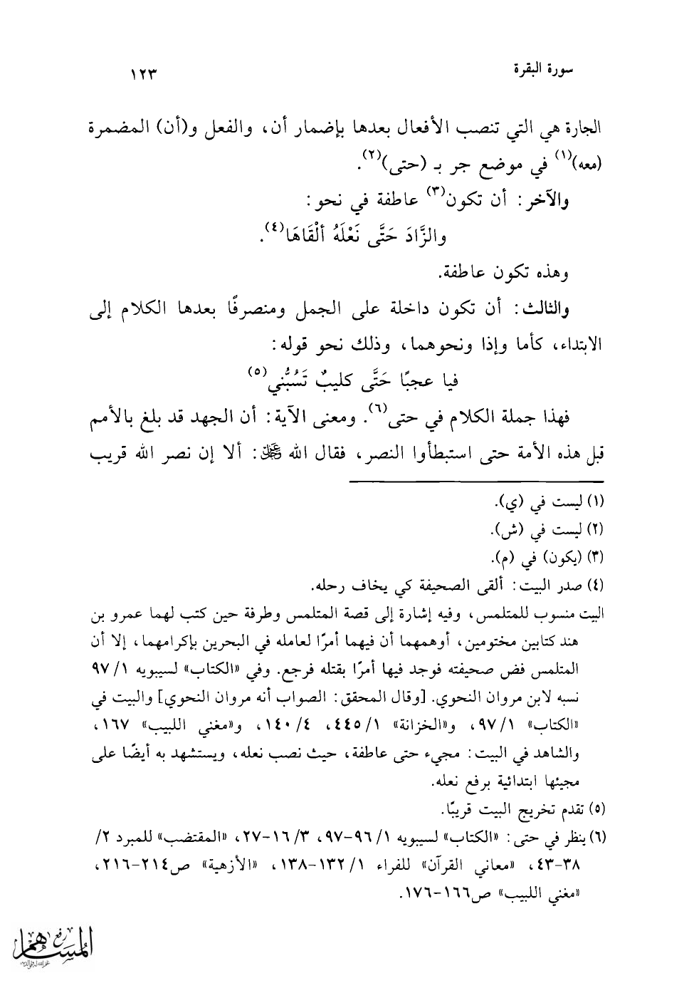 وقوله تعالى: {مَتَى نَصْرُ اللَّهِ} (متى) سؤال عن زمان؛ لأن جوابها يقع بالزمان، ألا ترى أنك تقول: متى زيد خارج؟، فيكون الجواب: يوم الجمعة أو يوم السبت، فإذا كان الاسم الذي يلي (متى) جثة احتاج إلى خبر، كقولك: متى زيد منطلق؟، ولا يجوز أن تقول: متى زيد، وتسكت؛ لأن ظروف الزمان لا تكون خبرًا للجثث، وإن كان الاسم الذي (يلي) (¬1) (متى) لا يكون جثة، حسن السكوت على ذلك الاسم، كقولك: متى القتال؟ وكما في هذه الآية {مَتَى نَصْرُ اللَّهِ}؛ لأن ظروف الزمان تكون خبرًا للمصادر (¬2).