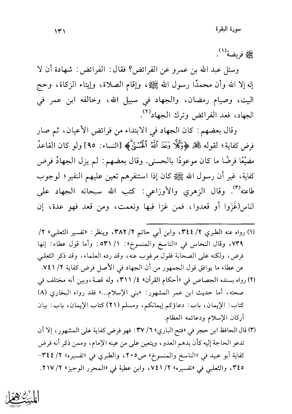 (¬2) قول الزهري رواه أبو عبيد في "الناسخ والمنسوخ" ص 204، وابن أبي حاتم في "تفسيره" 2/ 382، وقول الأوزاعي ذكره أبو عبيد في "الناسخ والمنسوخ" ص 205، والطبري في "تفسيره" 2/ 344.