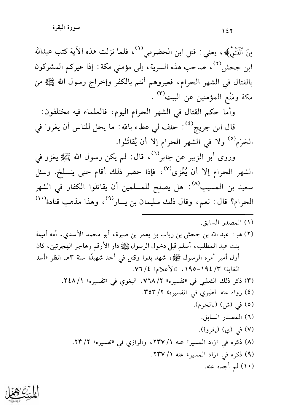 وغيره من العلماء، يرون القتال في الشهر الحرام، قال أبو عبيد: والناس اليوم بالثغور جميعًا على هذا القول، يرون الغزو مباحًا في الشهور كلها حلالها وحرامها ولم أر أحدًا من علماء الشام والعراق ينكره عليهم، وكذلك حب قول أهل الحجاز، والحجة في إباحته قوله جل ثناؤه: {فَاقْتُلُوا الْمُشْرِكِينَ حَيْثُ وَجَدْتُمُوهُمْ} [التوبة: 5]، هذه الآية عندهم ناسخة لتحريم القتال في الشهر الحرام.