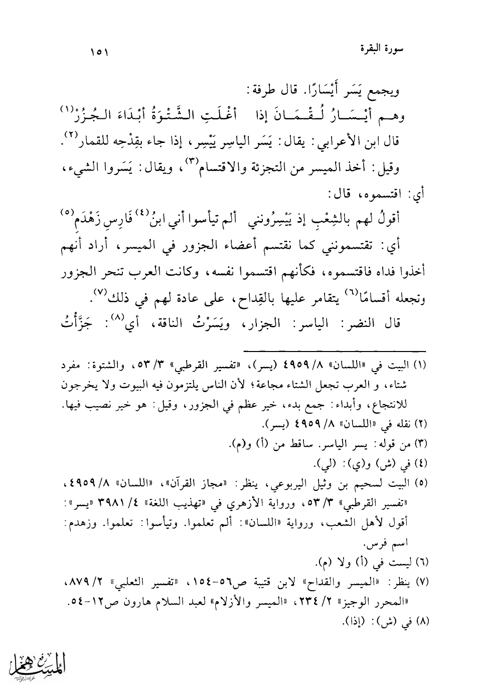 (¬3) ينظر في الميسر: "الميسر والقداح" لابن قتيبة، "تهذيب اللغة" 4/ 3981، "عمدة الحفاظ" 4/ 409، "لسان العرب" 8/ 4959 (يسر).