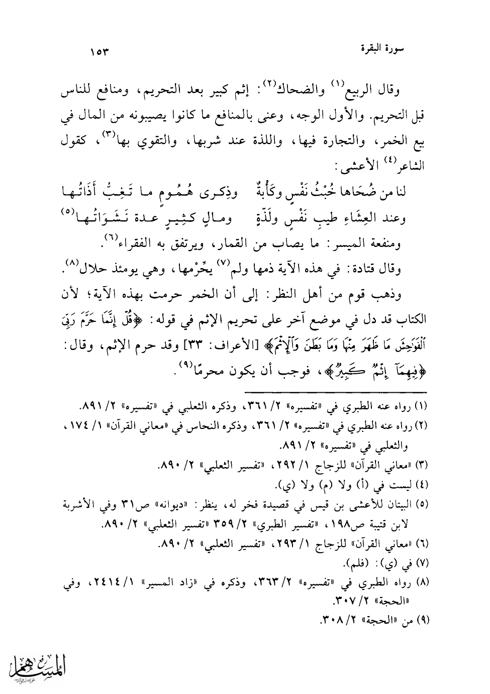 واختلف القراء في قوله: {إِثْمٌ كَبِيرٌ} فقرأ حمزة والكسائي (كثير) بالثاء، الباقون بالباء (1)، وحجتهم: أن الباء أولى؛ لأن الكِبَر مثلُ العِظَم، ومقابل الكِبرِ الصِّغَر، قال الله تعالى: {وَكُلُّ صَغِيرٍ وَكَبِيرٍ مُسْتَطَرٌ} [القمر: 53] وقد استعملوا في وصف الذنب العِظَمَ والكِبَرَ، يدل على ذلك قوله: {كَبَائِرَ الْإِثْمِ وَالْفَوَاحِشَ إِلَّا اللَّمَمَ} [النجم: 32]، {إِنْ تَجْتَنِبُوا كَبَائِرَ مَا تُنْهَوْنَ عَنْهُ} [النساء: 31]، بالباء، كذلك هاهنا ينبغي أن يكون بالباء، ألا ترى أن شرب الخمر والميسر من الكبائر.