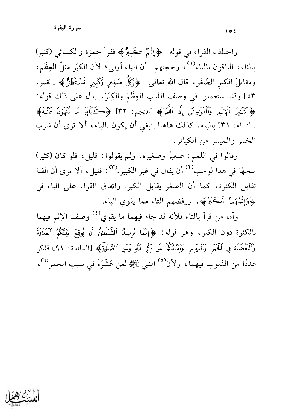 فدل على كثرة الإثم فيها، ولأن الإثم في هذه الآية عودل به المنافع فَحَسُنَ أن يوصف بالكثرة (¬1)؛ لأنه كأنه قال: فيه مضارٌّ كثيرةٌ ومنافعُ (¬2).