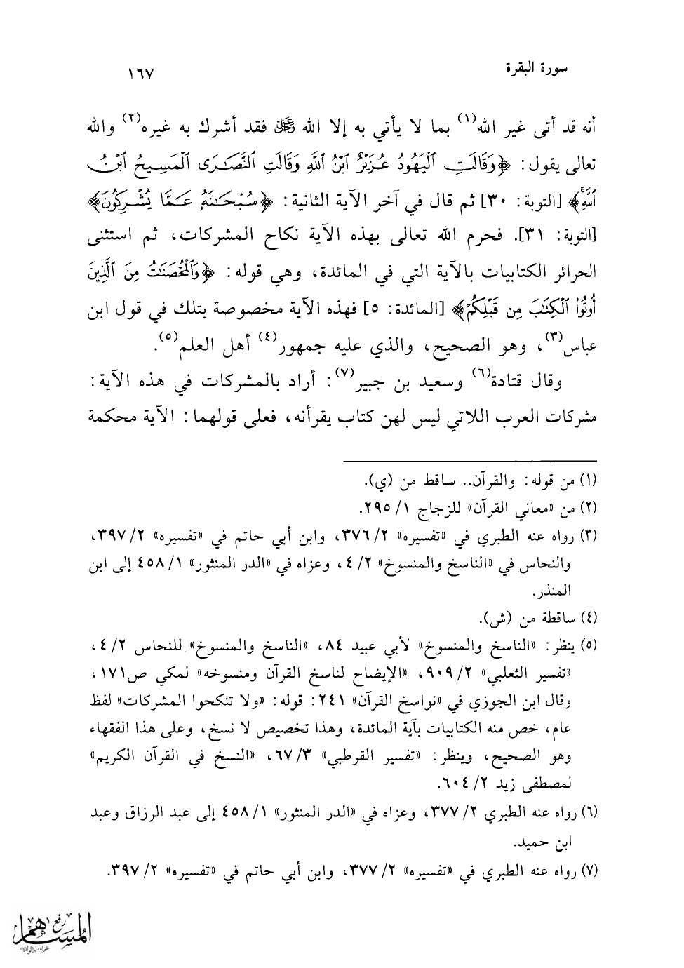 (¬1) قدم المؤلف أن آية المائدة مخصصة لآية البقرة على الصحيح، وعليه فإن مراده بالنسخ هنا التخصيص على العادة المعروفة عند المتقدمين.